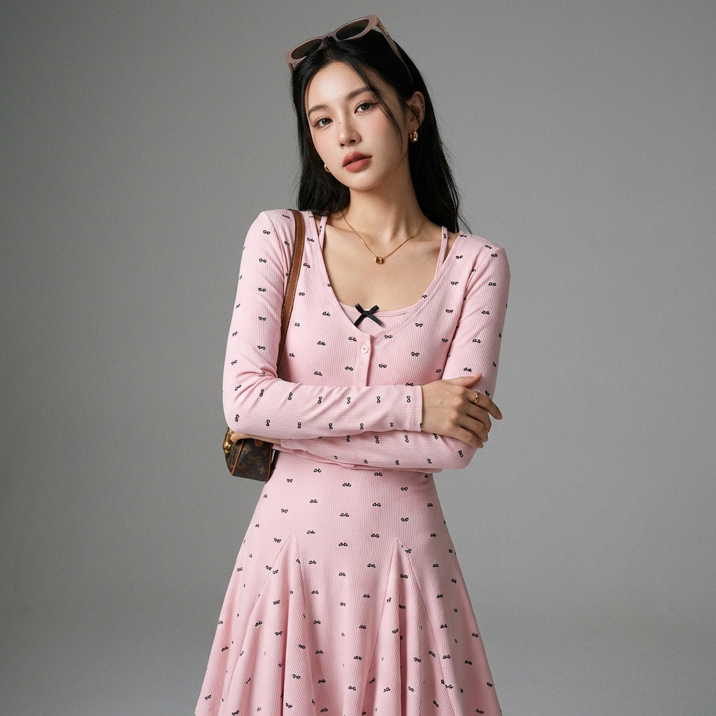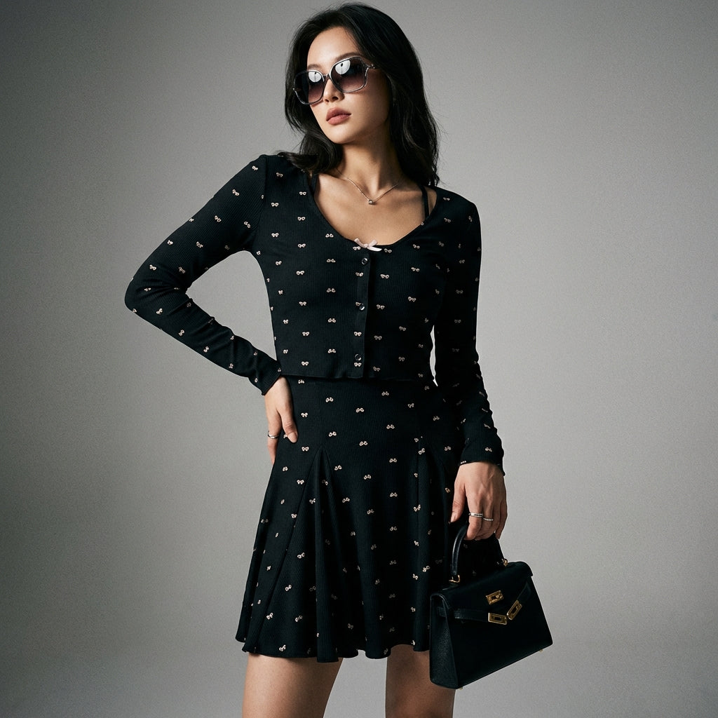 Kreieren Sie einen romantischen und modernen Look mit unserem langärmeligen Cardigan-Set und dem passenden Minirock. Der Cardigan besticht durch ein zartes Schleifenmuster, während der A-Linien-Rock mit schmaler Taille die Figur schmeichelt. Ideal für einen schicken und lässigen Stil! 🎀