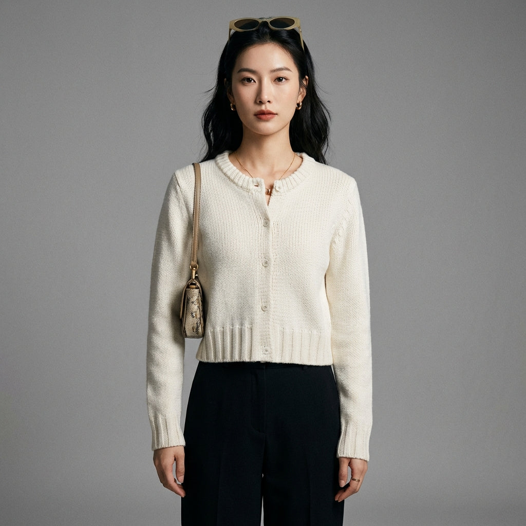 - Stil: Koreanische Mode, Elegant, Minimalistisch. Dieser Cardigan verkörpert die diskrete und moderne Eleganz der K-Fashion, perfekt für einen raffinierten und zeitlosen Look.