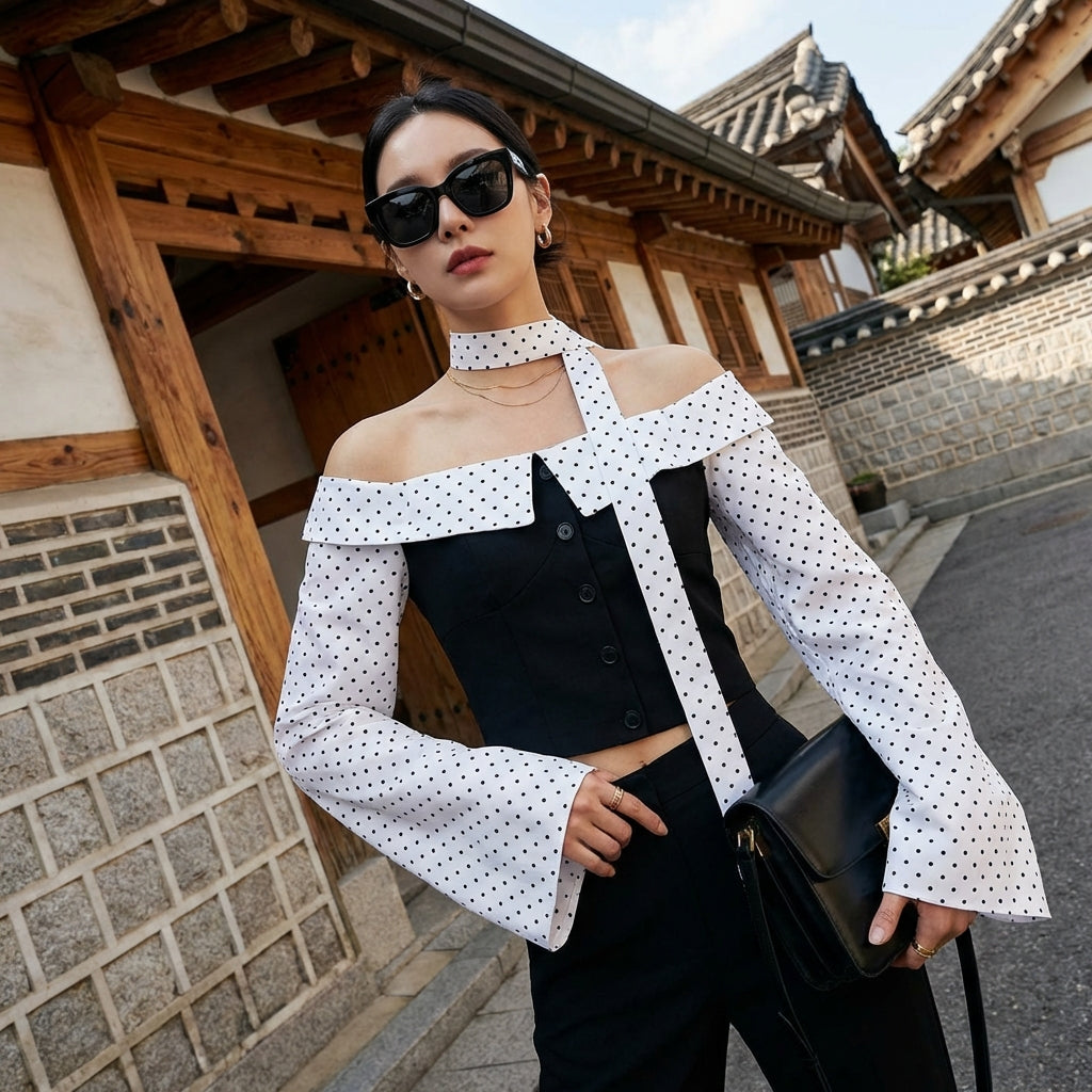 • Stil: K-Fashion, Modern, Gewagt. Dieses Top verkörpert den Geist der koreanischen Mode, mit einem zeitgenössischen Touch und einem Design, das nicht unbemerkt bleibt.