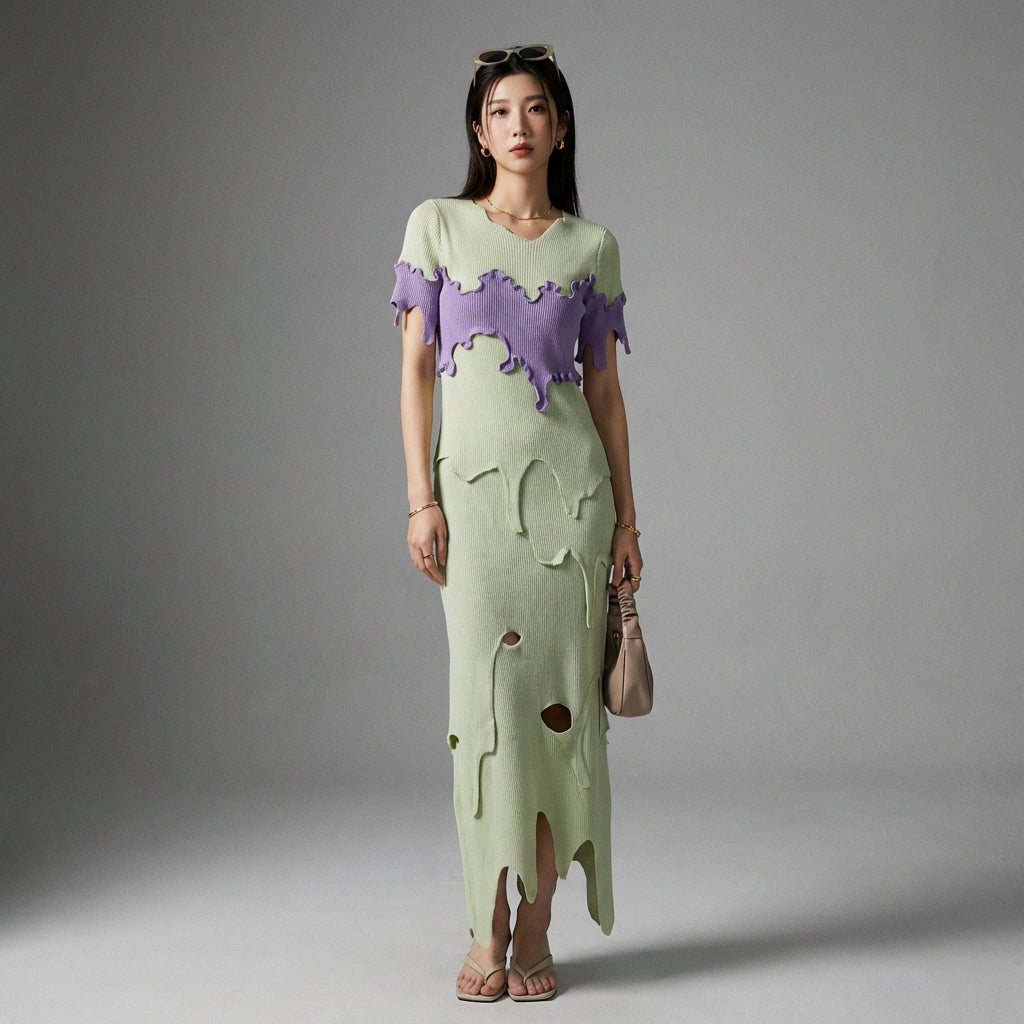 - Typ: Zweiteiliges Set, unregelmäßiger Rock, kontrastierendes Oberteil. Ein innovatives Design, das eine dynamische und stilvolle Silhouette bietet.