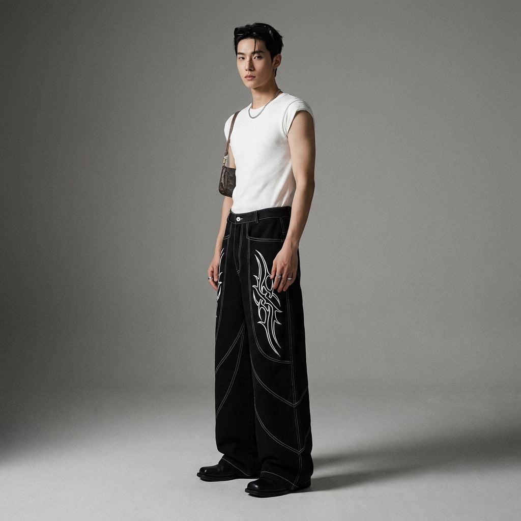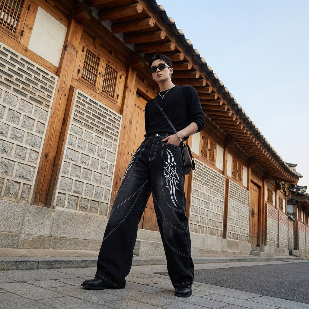 - Stil: Streetwear, Trend, K-Fashion. Diese Jeans verkörpert den Geist der koreanischen urbanen Mode mit einem Hauch von Originalität dank ihrer Stickereien.