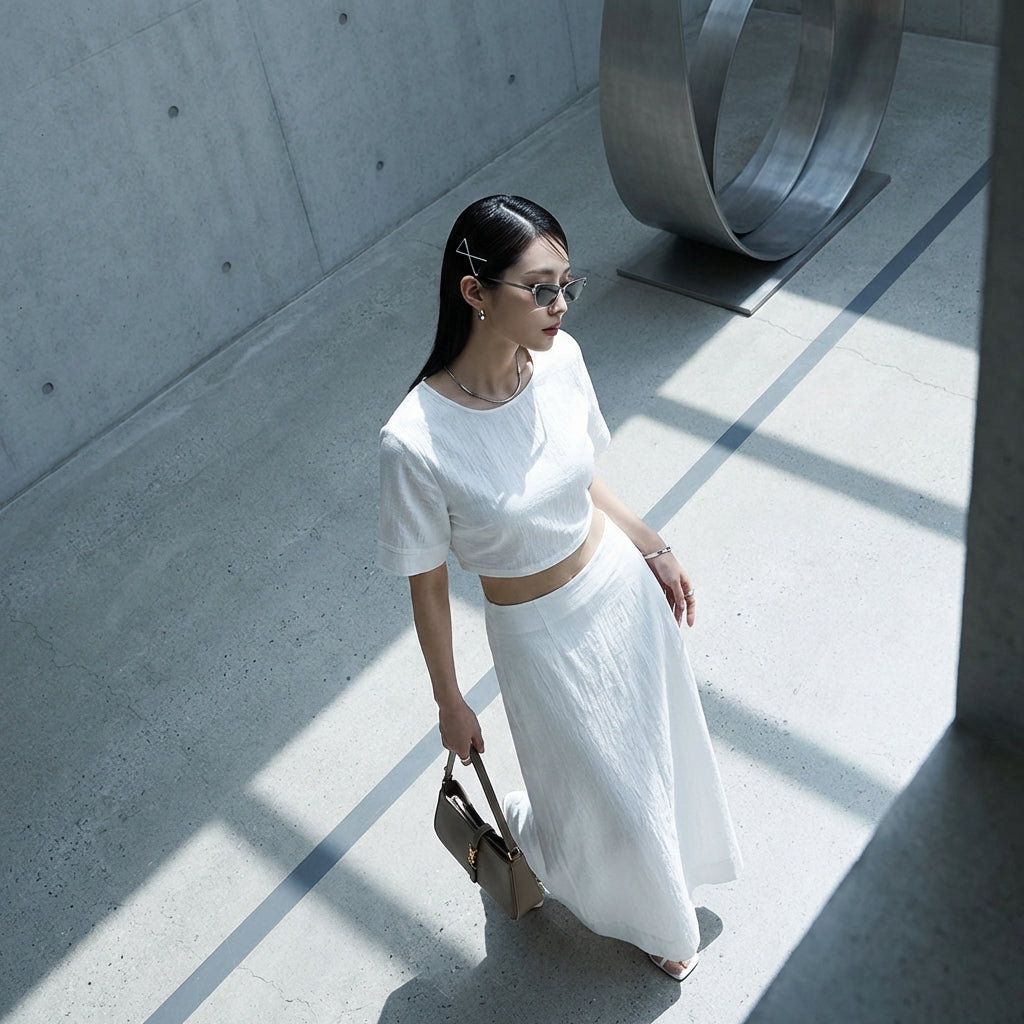 Kreieren Sie einen frischen und eleganten Look mit diesem aufeinander abgestimmten Set, perfekt für sonnige Tage. Bestehend aus einem Crop-Top mit Rundhalsausschnitt und einem fließenden langen Rock, vereint es Komfort und Stil für eine lässige, aber raffinierte Silhouette! ☀️