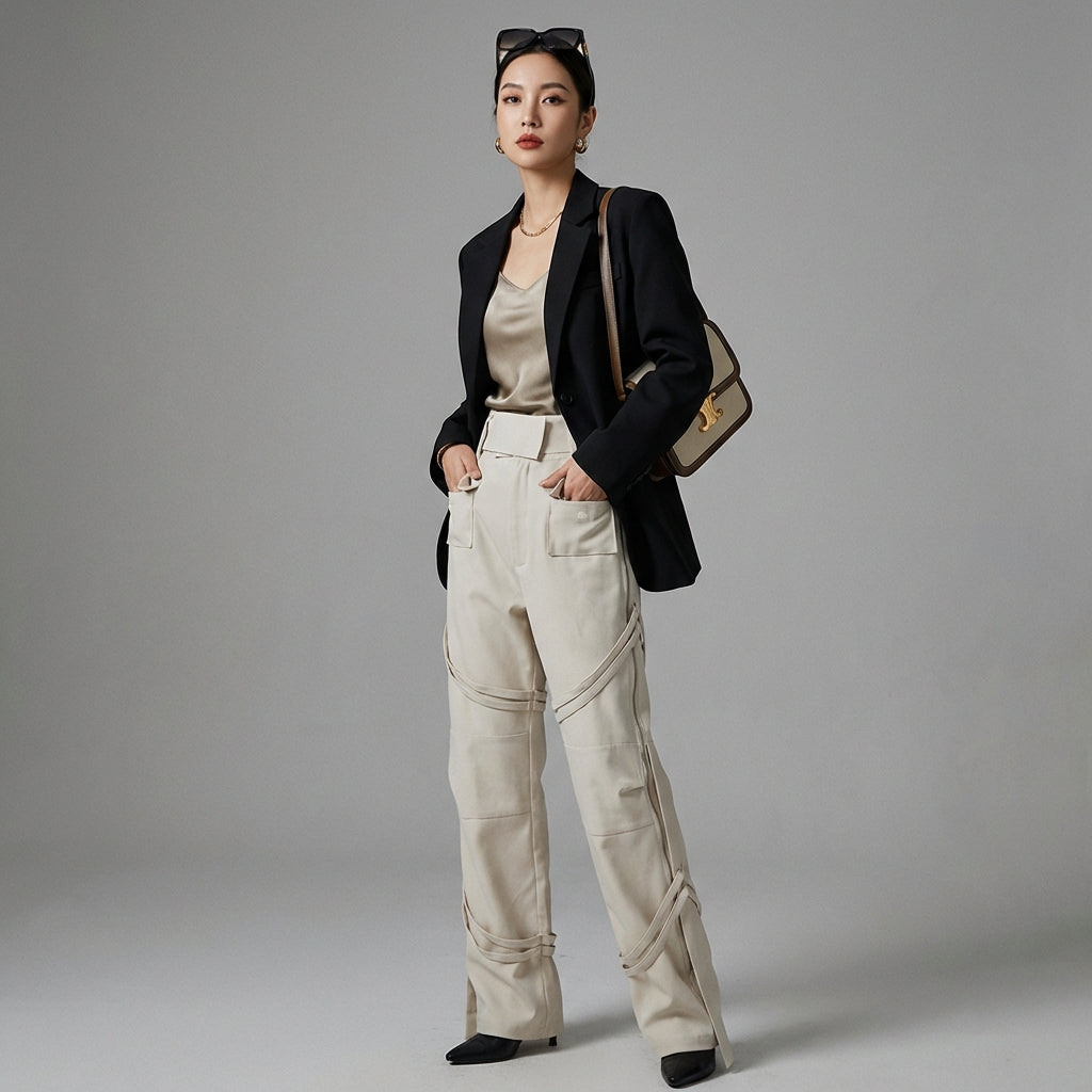 - Stil: Koreanische Mode, Elegant, Lässig. Diese Hose verkörpert die minimalistische Eleganz der K-Fashion, perfekt für einen gepflegten und trendigen Look.