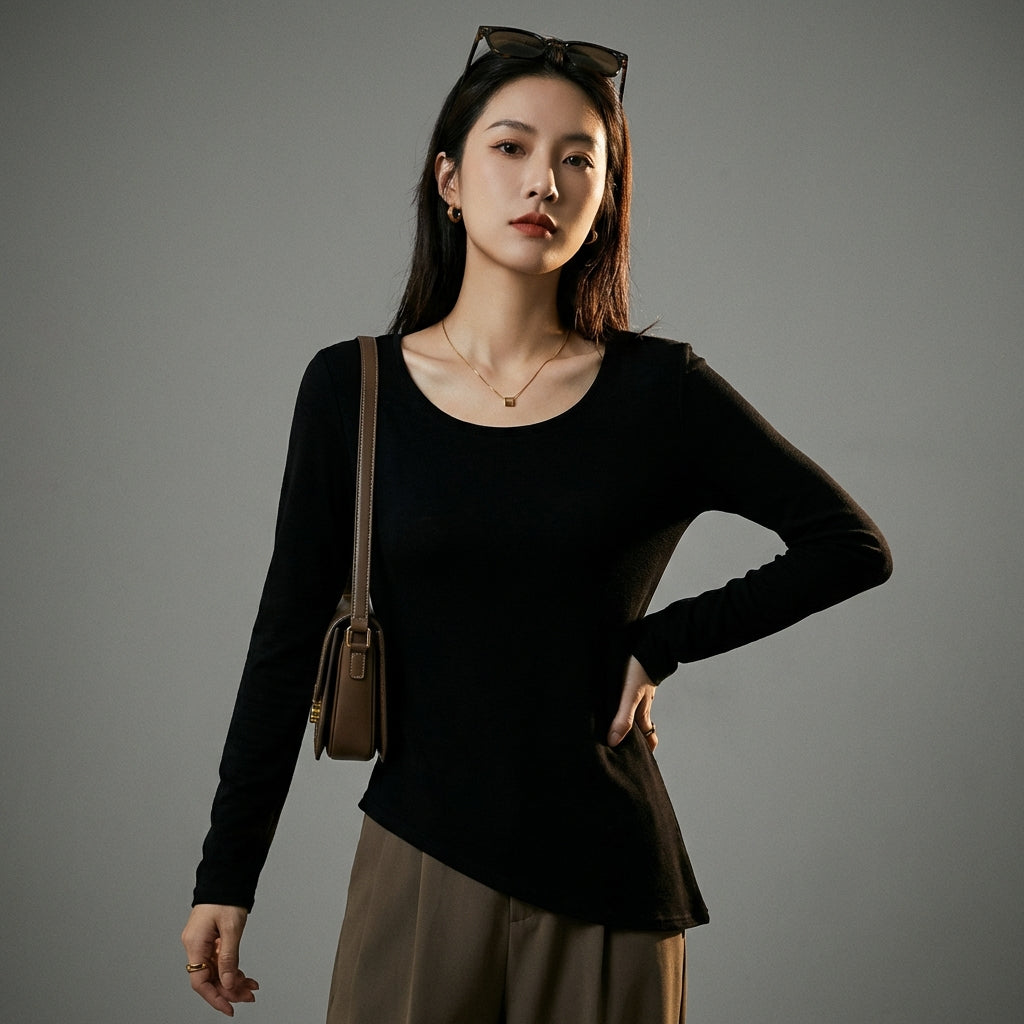 Kreieren Sie einen lässigen und modernen Look mit unserem Langarm-T-Shirt, das mit einem unregelmäßigen Saum und Seitenschlitzen für einen Hauch von Originalität versehen ist. Perfekt für einen urbanen und bequemen Alltagsstil! ✨