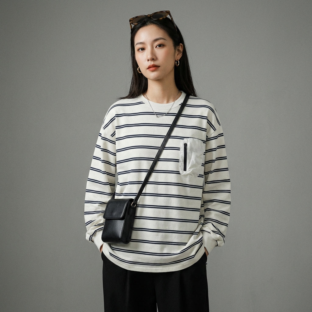Kreieren Sie einen lässigen und trendigen Look mit unserem gestreiften Oversize-T-Shirt. Ideal zum Überziehen oder alleine Tragen, verkörpert es Komfort und Streetwear-Stil. Ein vielseitiges Essential für jede Garderobe! ✨