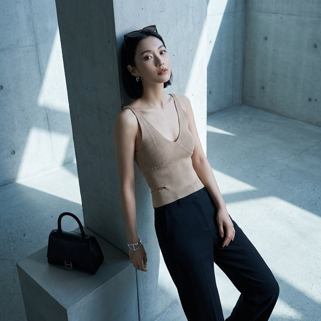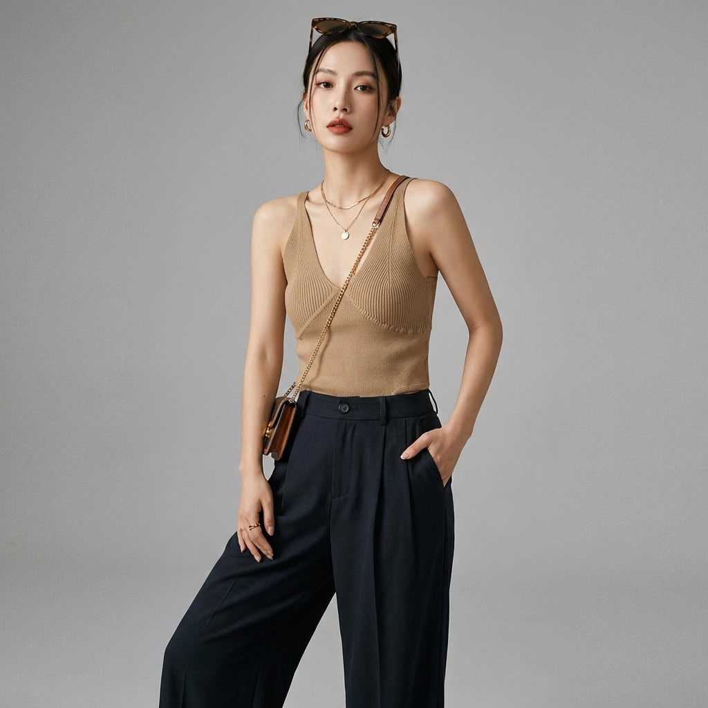Dieses gestrickte Tanktop ist das perfekte Kleidungsstück, um eine Vielzahl von Outfits zu kreieren, die Komfort und Stil mit einem Hauch koreanischer Modernität verbinden.