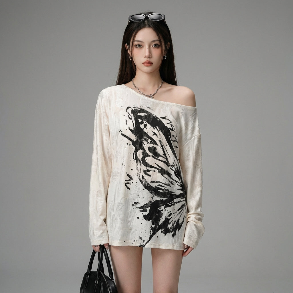 Betonen Sie Ihren Stil mit diesem langärmeligen Hemd mit schrägem Kragen, verziert mit einem zarten Schmetterlingsdruck. Sein perforiertes Design und der lockere Schnitt verleihen einen Look, der gleichzeitig sanft und gewagt ist, perfekt für einen trendigen und lässigen Auftritt! 🦋