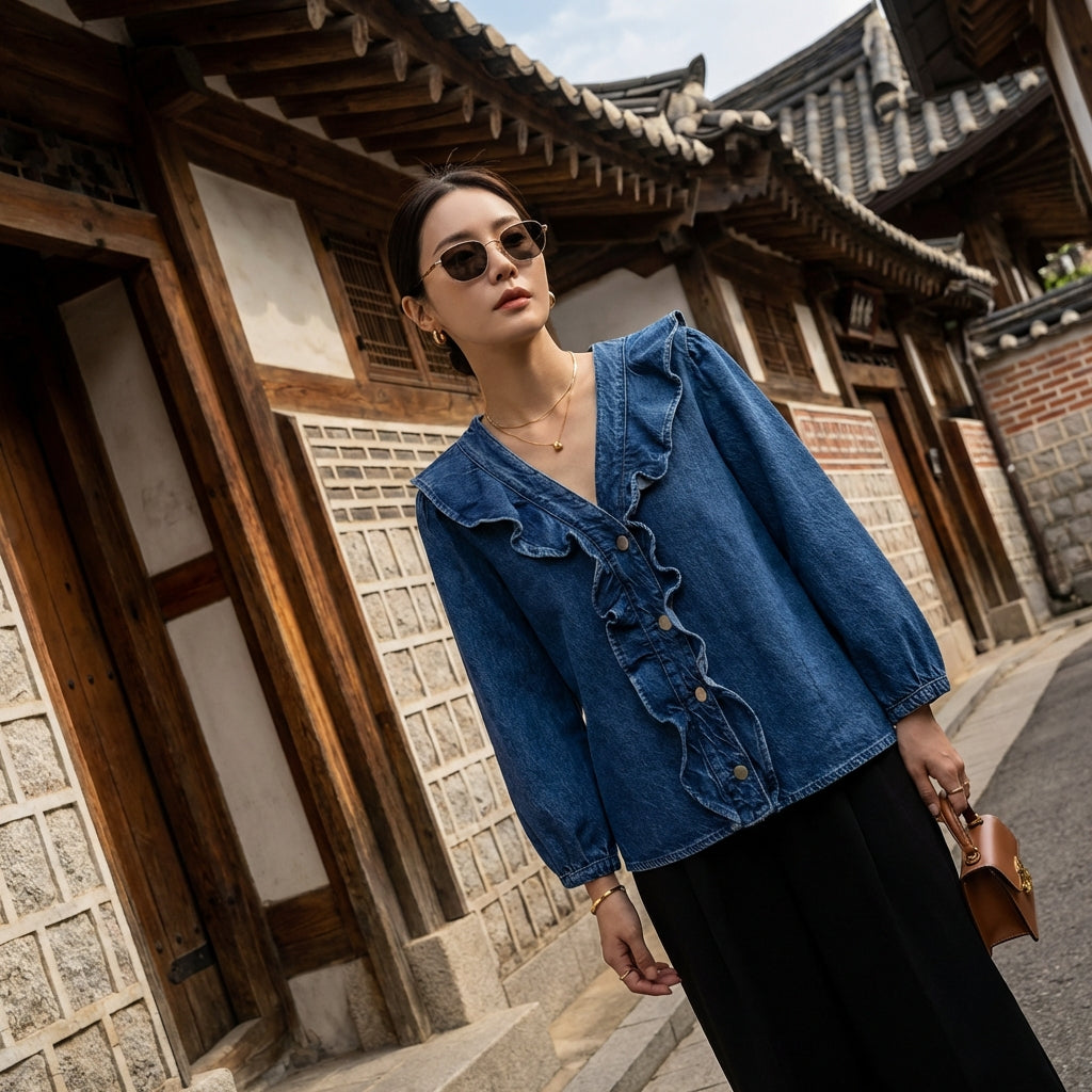 Kreieren Sie einen trendigen und lässigen Look mit unserem Rüschen-Jeanshemd mit V-Ausschnitt. Sein frisches Design und der elegante Schnitt machen es zu einem unverzichtbaren Bestandteil Ihrer Garderobe für einen mühelosen Stil! 🌸
