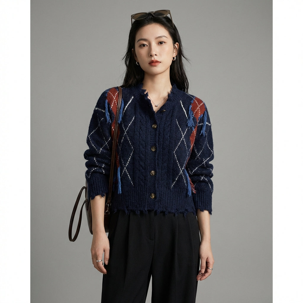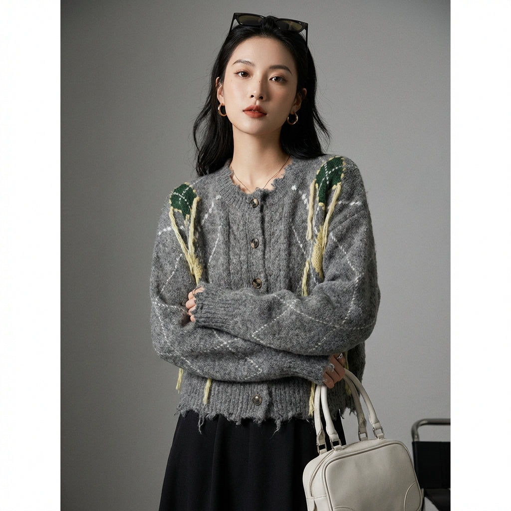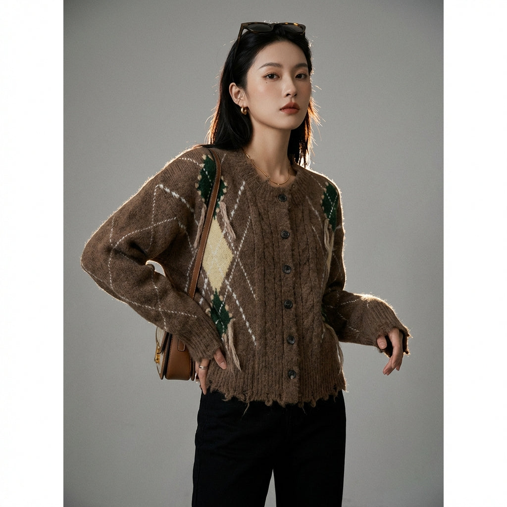 Kreieren Sie einen lässigen und schicken Look mit unserem gestrickten Cardigan, der mit einem kontrastierenden Rautenmuster und Pompon-Details versehen ist. Sein lockerer Schnitt und sein "Lazy"-Stil machen ihn zum perfekten Kleidungsstück für optimalen Komfort ohne Kompromisse bei der Eleganz. Ideal zum Überziehen und um Ihren Alltagsoutfits einen Hauch von Raffinesse zu verleihen! ✨
