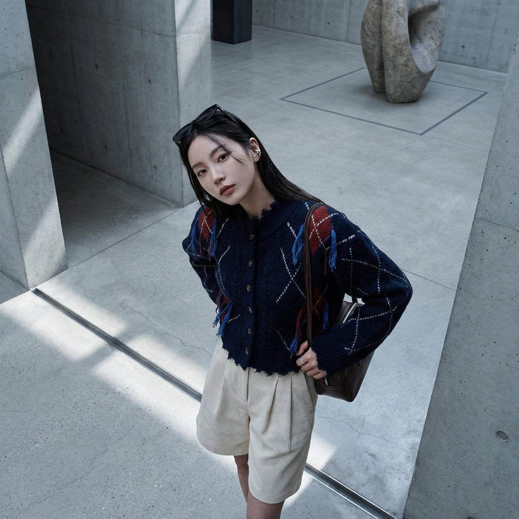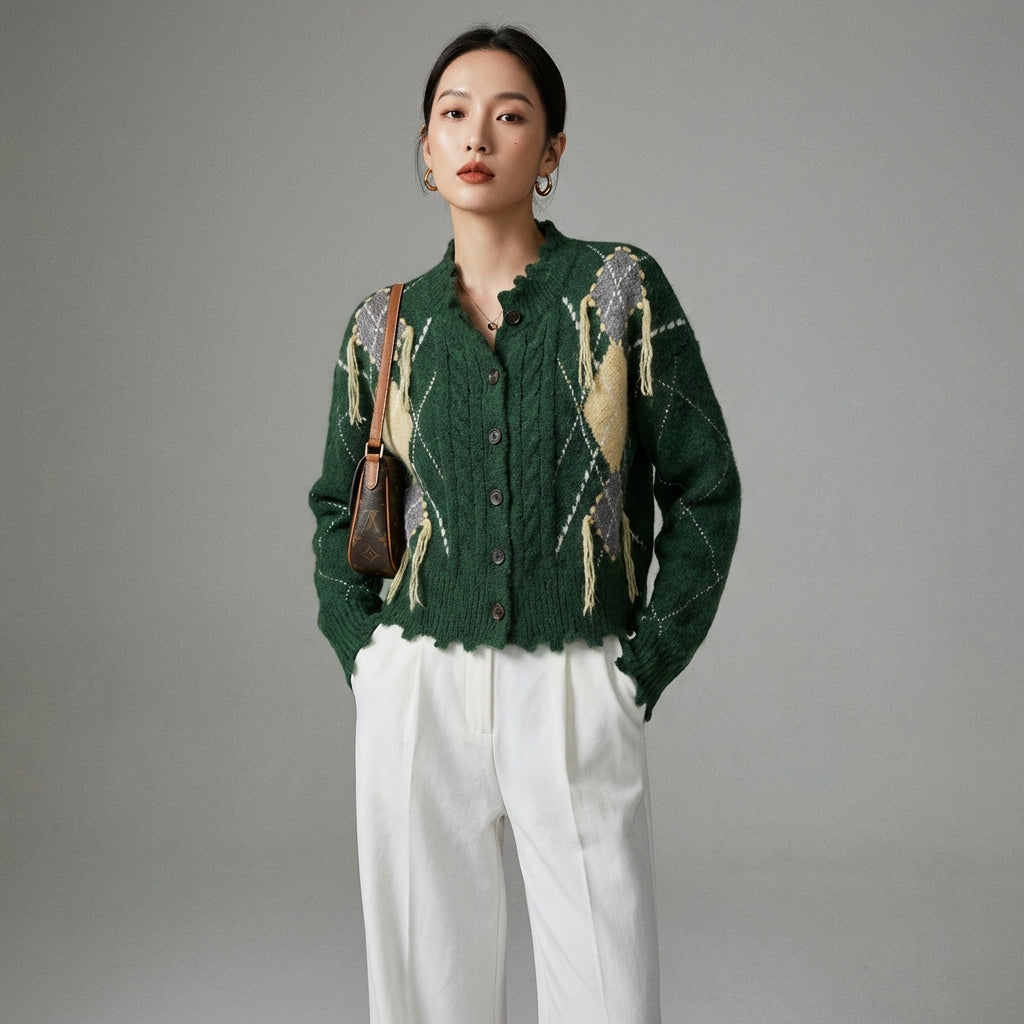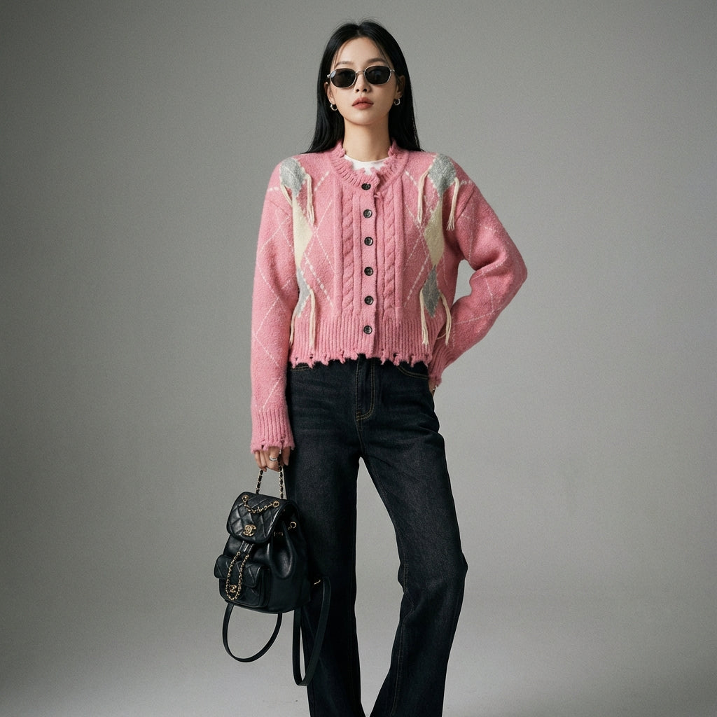 Kreieren Sie einen lässigen und schicken Look mit unserem gestrickten Cardigan, der mit einem kontrastierenden Rautenmuster und Pompon-Details versehen ist. Sein lockerer Schnitt und sein "Lazy"-Stil machen ihn zum perfekten Kleidungsstück für optimalen Komfort ohne Kompromisse bei der Eleganz. Ideal zum Überziehen und um Ihren Alltagsoutfits einen Hauch von Raffinesse zu verleihen! ✨