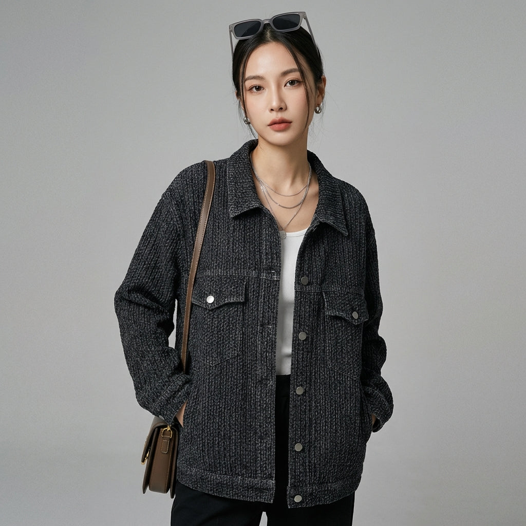 - Stil: Streetwear, Casual, K-Fashion. Diese Jacke verkörpert den Geist der koreanischen Mode mit einem weiten Schnitt und einem zeitlosen Design, ideal für einen urbanen Look.
