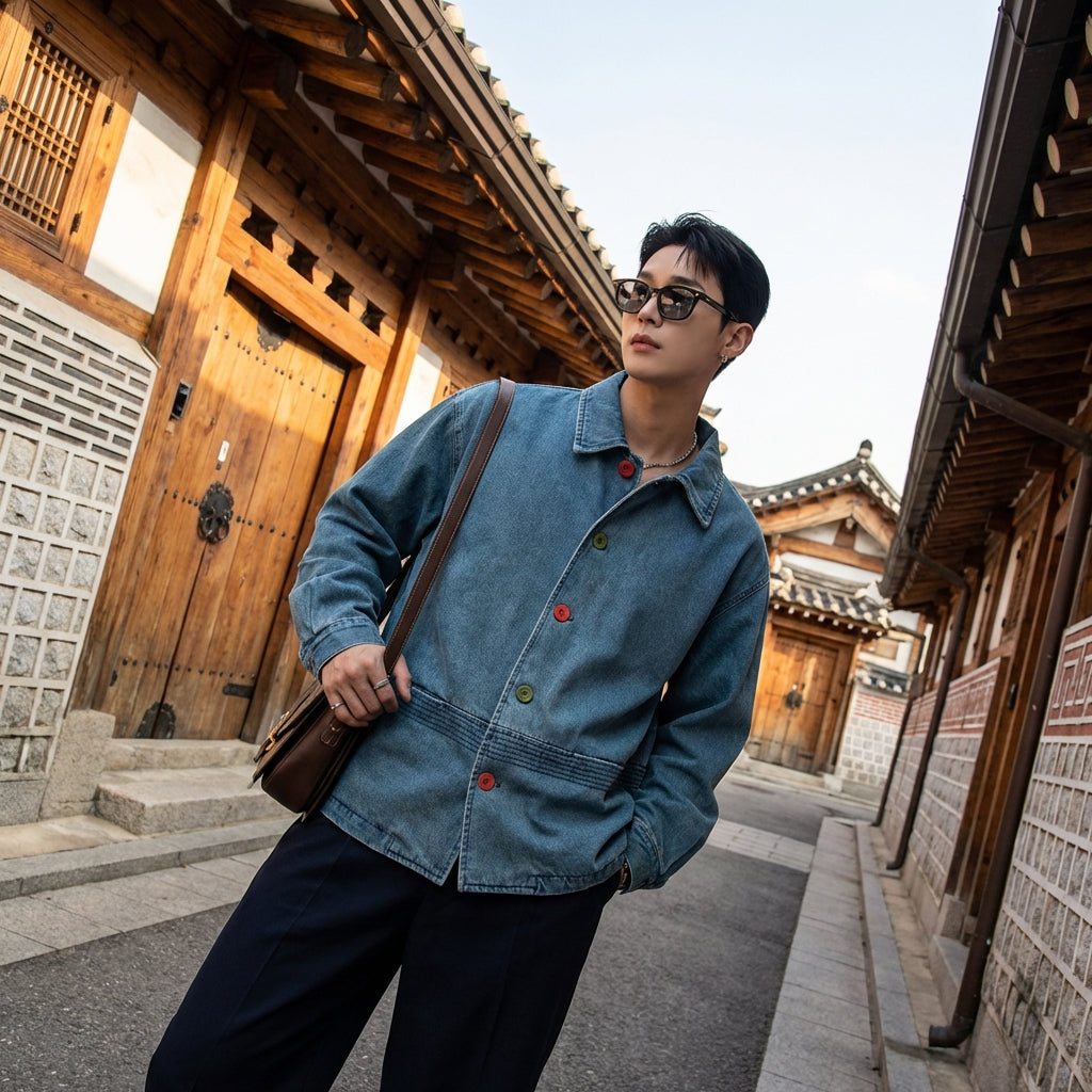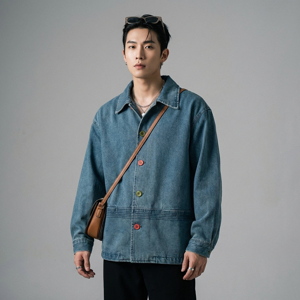 Veste denim oversize homme avec boutons colorés - Koreanxwear