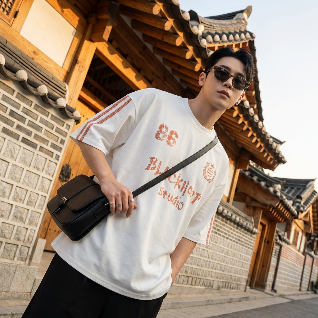 - Stil: Streetwear, K-Fashion, Lässig. Dieses T-Shirt verkörpert die lässige und trendige Ästhetik der koreanischen Urban Fashion, perfekt für einen gewagten Look.