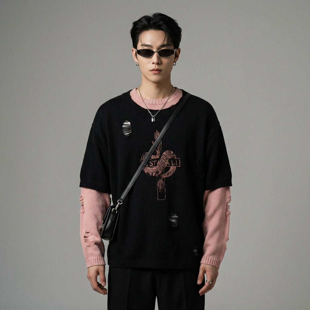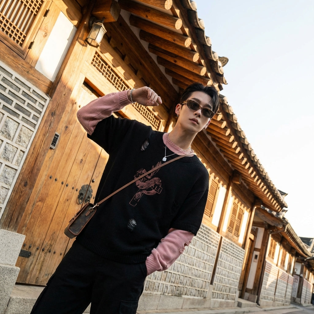 • Stil: Streetwear, Retro, K-Fashion. Dieser Pullover verkörpert den koreanischen Urban-Stil mit seinen Destroyed-Details und seinem weiten Schnitt, perfekt für einen lässigen und trendigen Look.