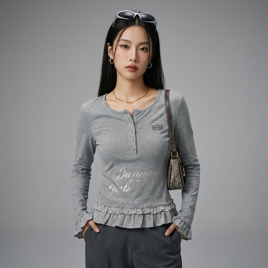 Betonen Sie Ihre Persönlichkeit mit diesem schmal geschnittenen Langarm-T-Shirt, verziert mit Rüschendetails und einem markanten Karomuster. Ein trendiges Oberteil, perfekt, um Ihren Alltagsstil aufzuwerten! ✨