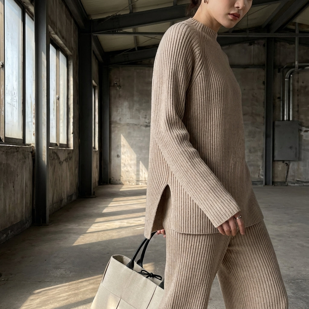 - Typ: Zweiteiliges Set, Pullover mit Schlitz, weite Hose. Ein moderner und bequemer Schnitt, der eine elegante und lässige Silhouette gewährleistet.