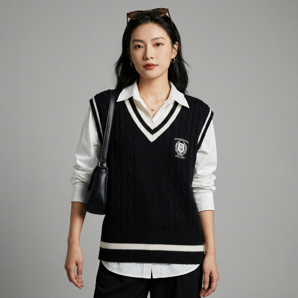 Kreieren Sie einen trendigen und lässigen Look mit unserem ärmellosen Pullover im College-Stil. Sein zweifarbiges Design und der V-Ausschnitt verleihen Ihren Herbst- und Frühlingsoutfits einen modernen Touch! 🍂