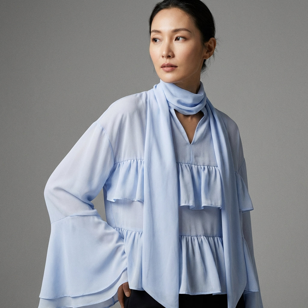 Verleihen Sie sich einen raffinierten Look mit unserer blauen Chiffon-Bluse im Lagenlook, mit eleganten „Horn“-Ärmeln und einem klassischen Umlegekragen. Ihre leichte und fließende Textur sorgt für optimalen Komfort und einen Hauch von Raffinesse für alle Gelegenheiten! 💙