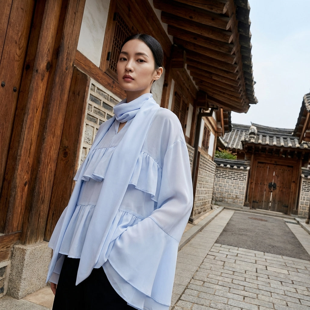 Diese Bluse ist ein Schlüsselstück für jede Garderobe und bietet unaufdringliche Eleganz und einen zeitlosen Stil, inspiriert von den neuesten koreanischen Trends.
