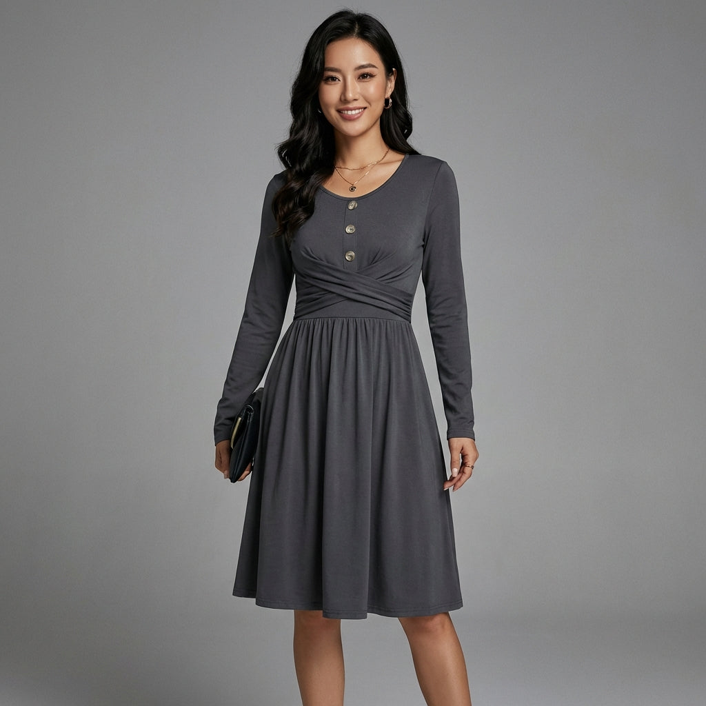 - Stil: Elegant, Minimalistisch, K-Fashion. Dieses Kleid verkörpert die Raffinesse und Einfachheit der koreanischen Mode, perfekt für einen gepflegten Look.