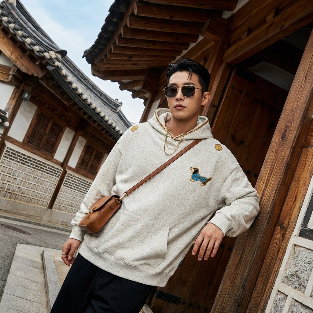 - Stil: Streetwear, Retro, K-Fashion. Dieser Hoodie verkörpert den lässigen und trendigen Geist der urbanen Mode, mit einem Vintage-Touch, inspiriert von koreanischen Trends.
