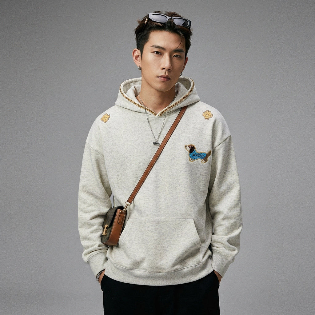 Kreieren Sie einen lässigen und stilvollen Look mit unserem Hoodie, der mit einem Retro-Hundemotiv bestickt ist. Perfekt, um Ihren Alltagsoutfits einen Hauch von Originalität zu verleihen, kombiniert dieser Kapuzenpullover Komfort und Trend für einen selbstbewussten Streetwear-Stil! 🐾
