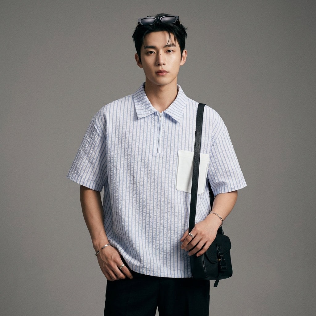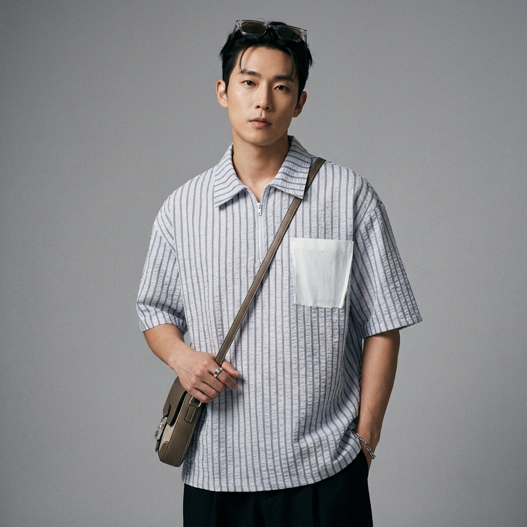 Kreieren Sie einen modernen und lässigen Look mit unserem zweifarbigen Streifenhemd. Mit Umlegekragen und Reißverschluss bietet es eine weite Passform für optimalen Komfort und einen selbstbewussten Stil! 🚀