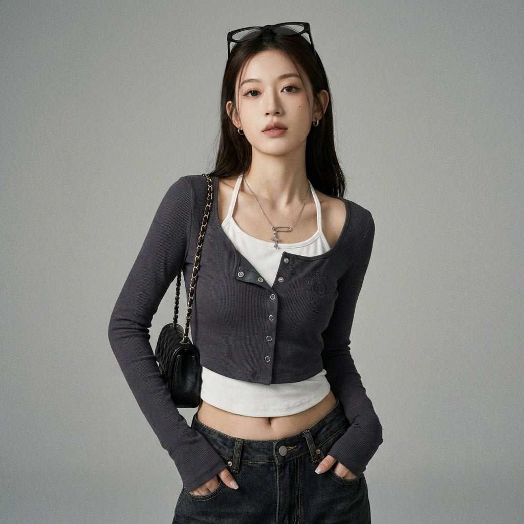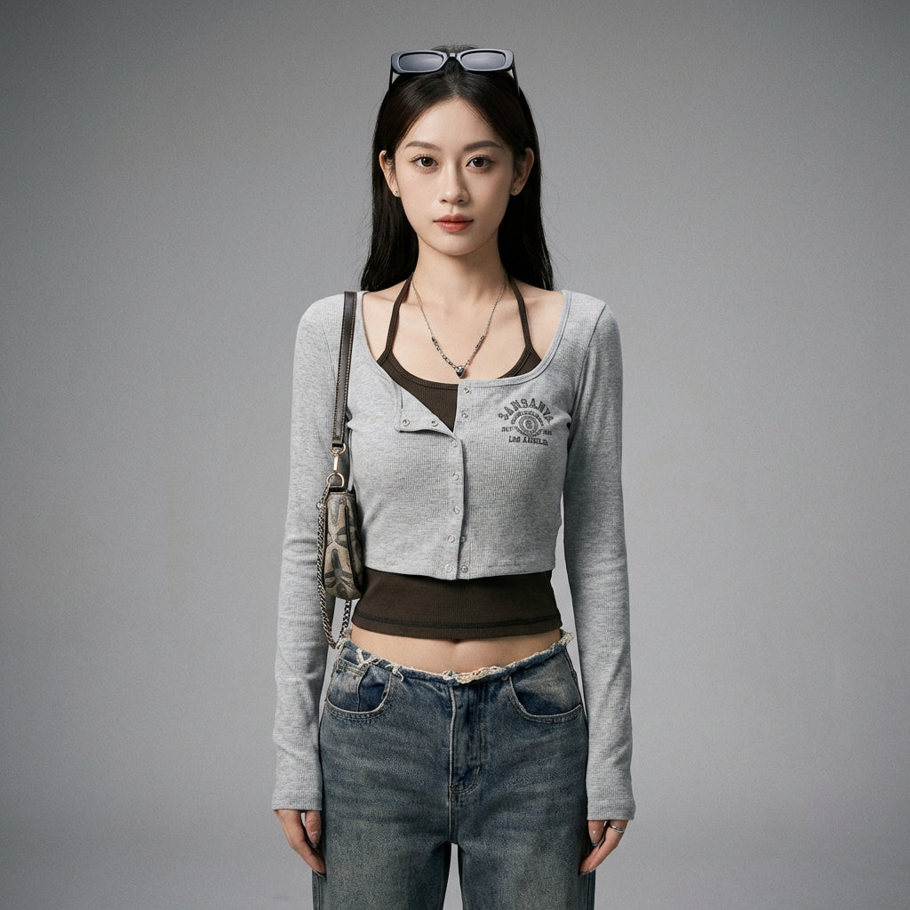 Betonen Sie Ihren Stil mit unserem langärmeligen „Faux-Zweiteiler“-Crop-Top, das für eine figurbetonte und moderne Silhouette entworfen wurde. Sein elegantes Design und der kurze Schnitt machen es zu einem Must-have für einen trendigen und selbstbewussten Look! ✨