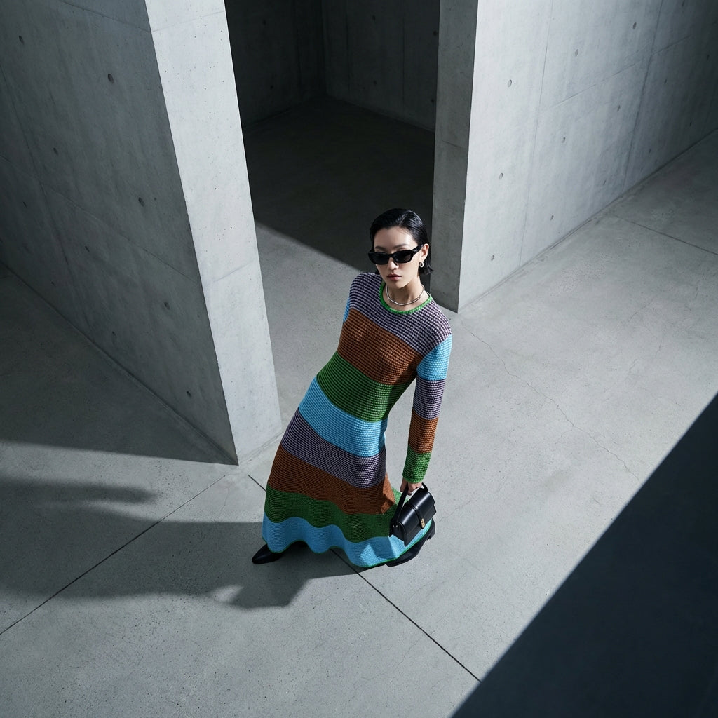 Dieses zweifarbige Strickkleid ist ein Must-have für alle, die ein vielseitiges Stück suchen, das sich sowohl an einen Streetwear-Stil als auch an ein anspruchsvolleres Outfit anpassen lässt und dabei die neuesten K-Fashion-Trends widerspiegelt.