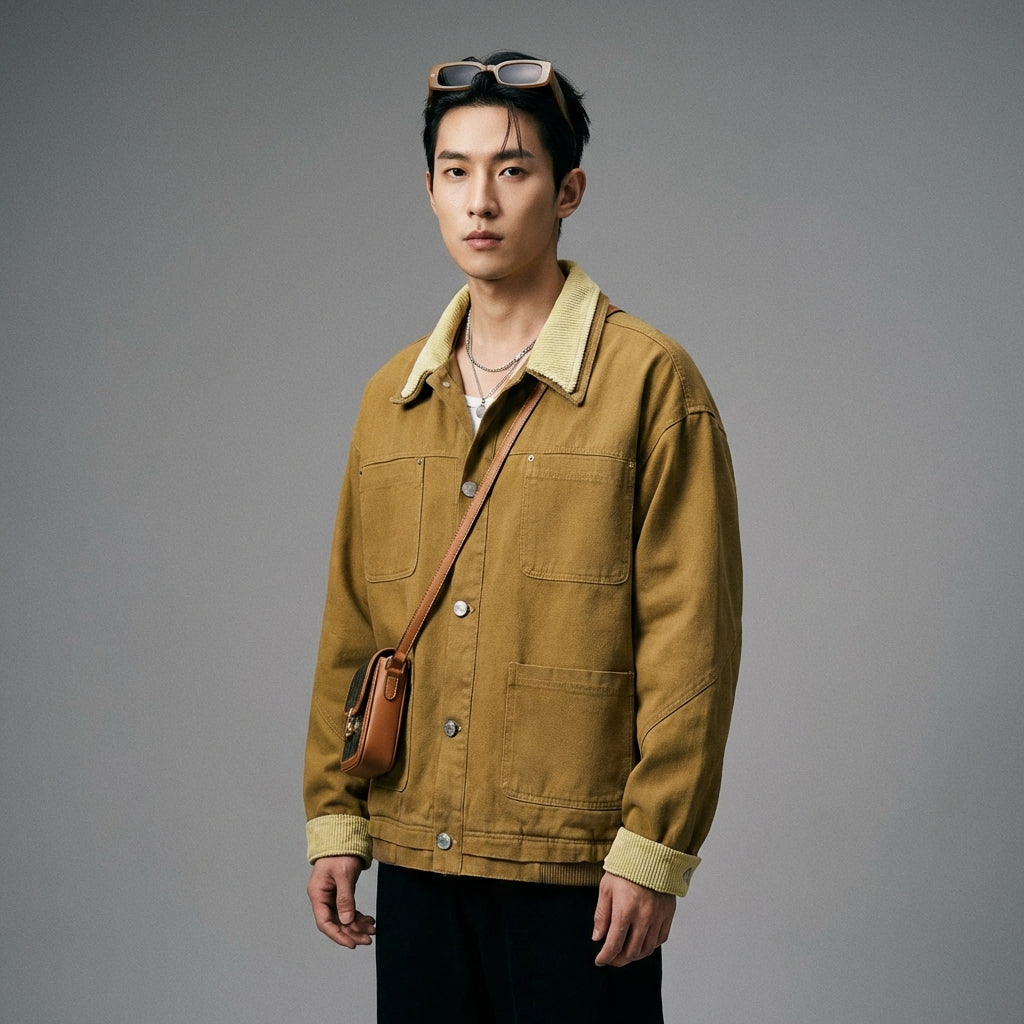 Entscheiden Sie sich für einen kühnen und funktionalen Look mit unserer Retro-Workwear-Jacke, die mit mehreren Taschen für einen praktischen und trendigen Stil ausgestattet ist. Ihr Umlegekragen und ihr bequemer Schnitt machen sie zu einem unverzichtbaren Begleiter für alle Jahreszeiten! 🍂