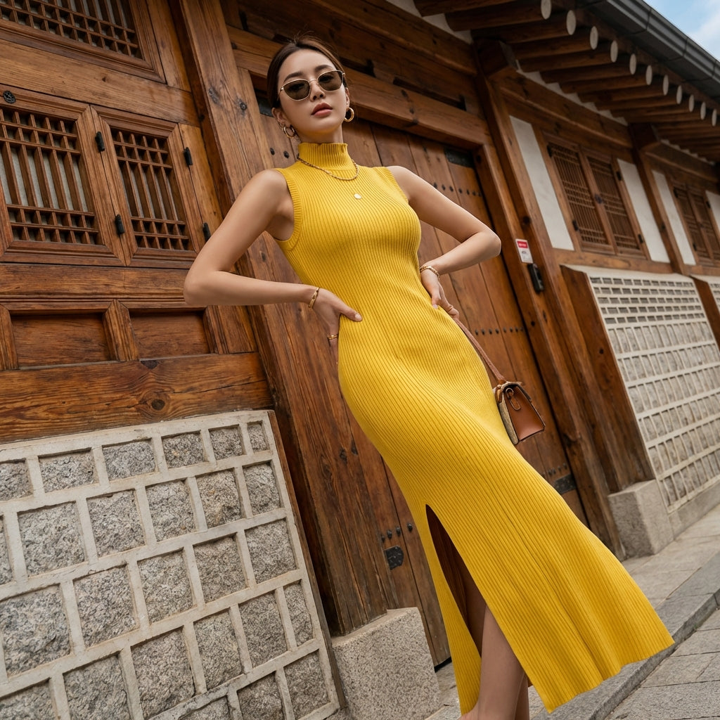 - Stil: Minimalistisch, Chic, Trendig. Inspiriert von der K-Fashion, vereint dieses Kleid Einfachheit und Raffinesse, ideal für einen urbanen Stil oder einen entspannten Abend.