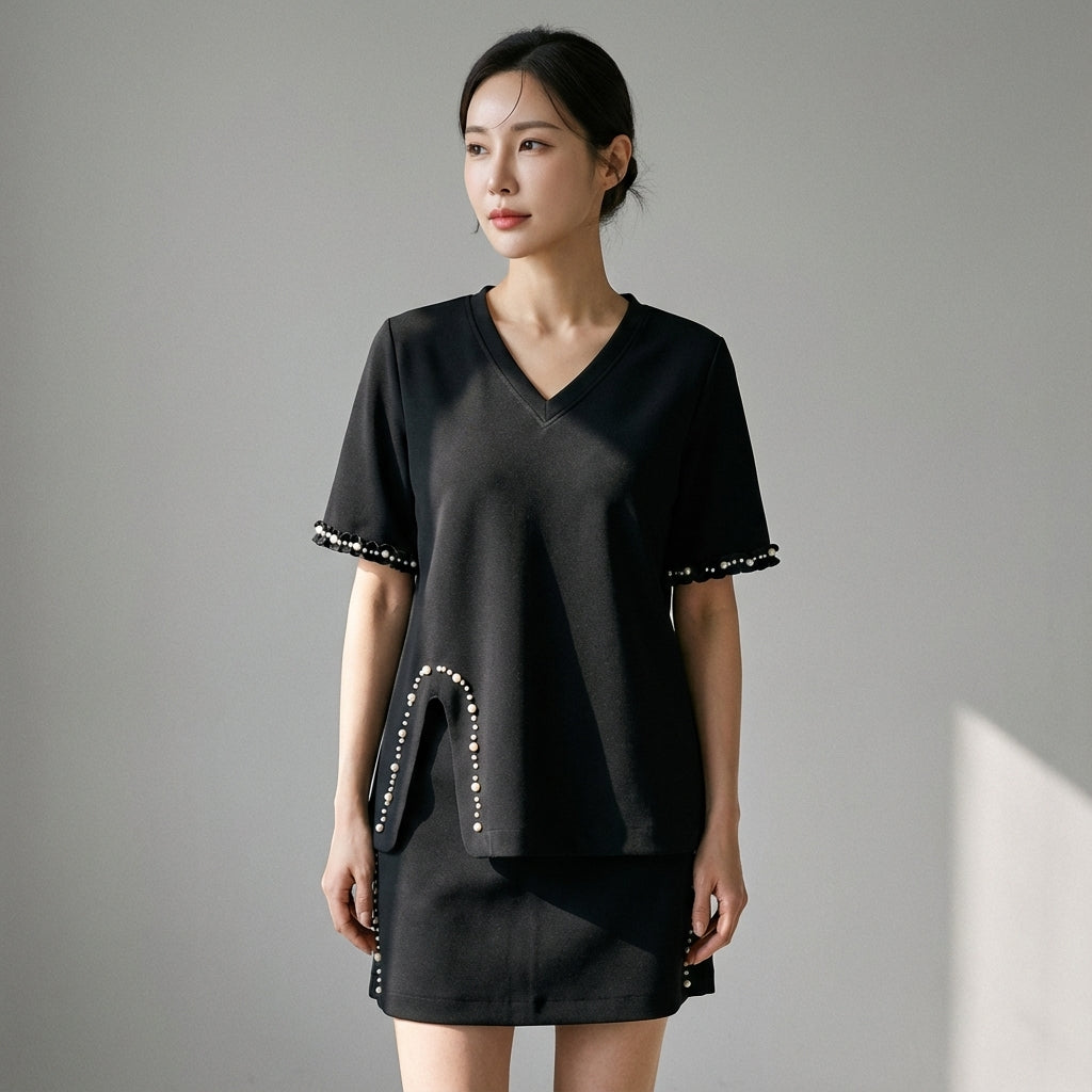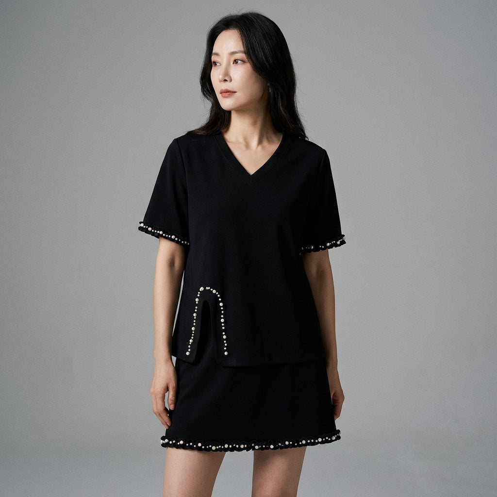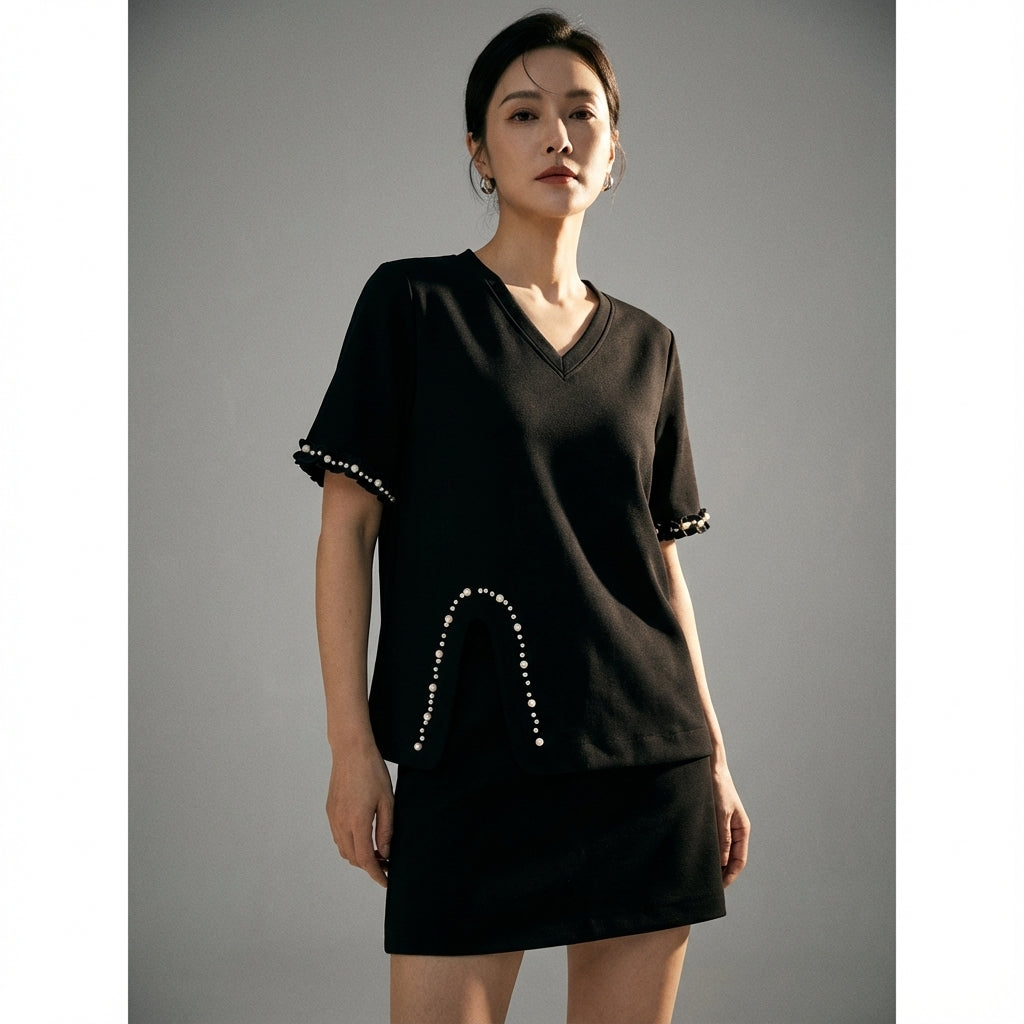 Kreieren Sie einen trendigen und lässigen Look mit unserem zweiteiligen Set, bestehend aus einem V-Ausschnitt-T-Shirt mit Schulterpolstern und einem kurzen Rock mit elastischem Bund. Ein einfaches und schickes Outfit, perfekt für alle Gelegenheiten! ✨