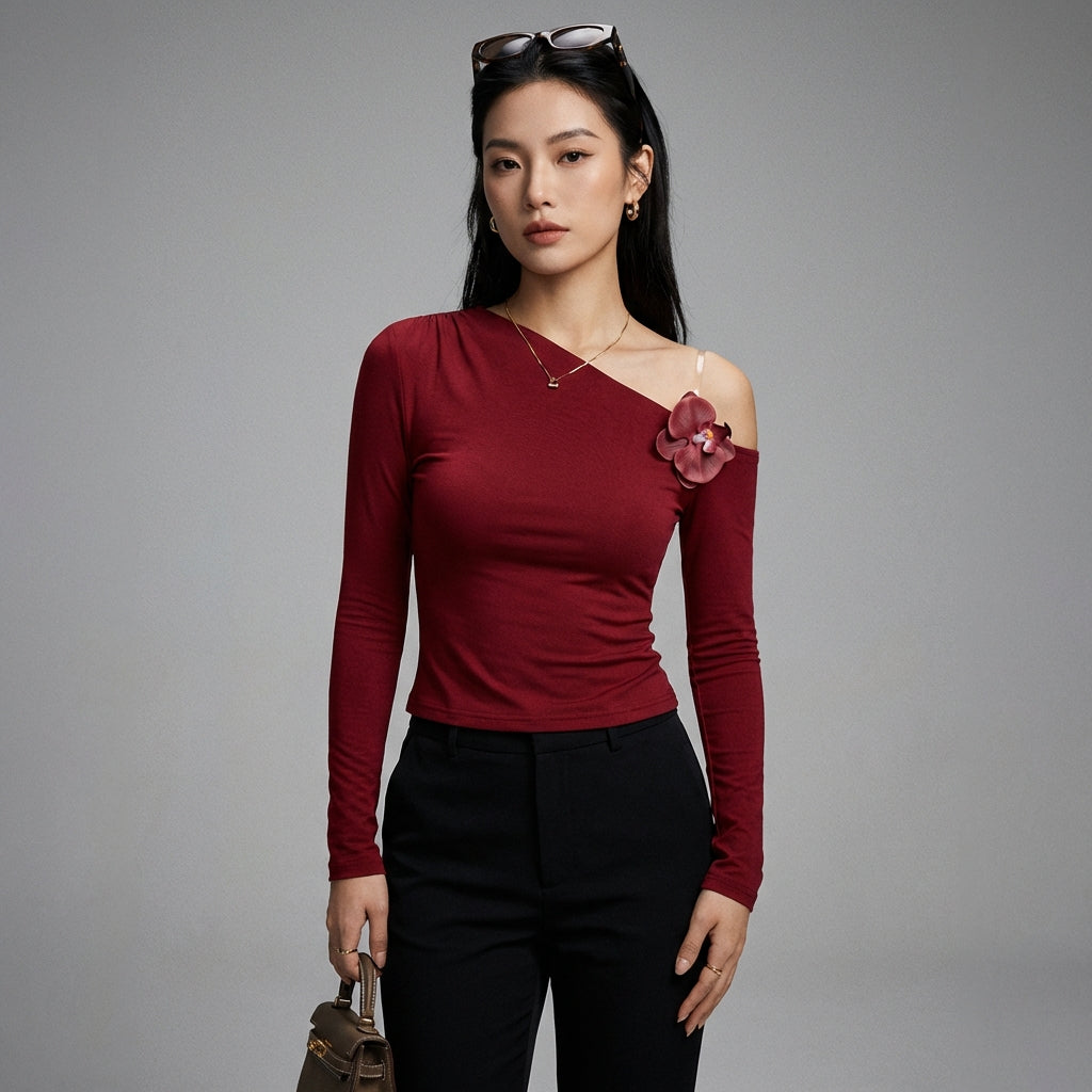 Betonen Sie Ihren Stil mit unserem floralen Off-Shoulder-T-Shirt, einem gewagten und modernen Stück. Sein schmaler Schnitt und die langen Ärmel betonen Ihre Figur, während das Blumenmuster einen Hauch von Romantik verleiht. Perfekt für einen trendigen und raffinierten Look! 🌸
