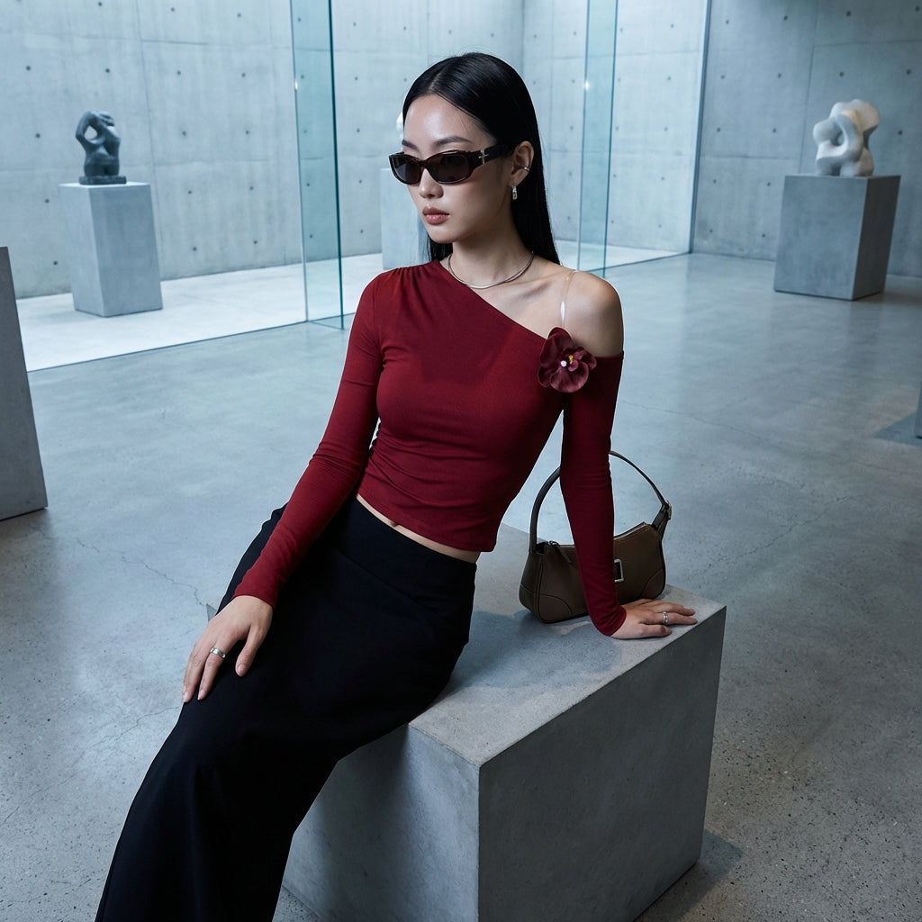 - Stil: Koreanische Mode, Trendig, Chic. Dieses T-Shirt verkörpert die moderne Eleganz der K-Fashion, perfekt für Liebhaberinnen von gewagten und raffinierten Looks.
