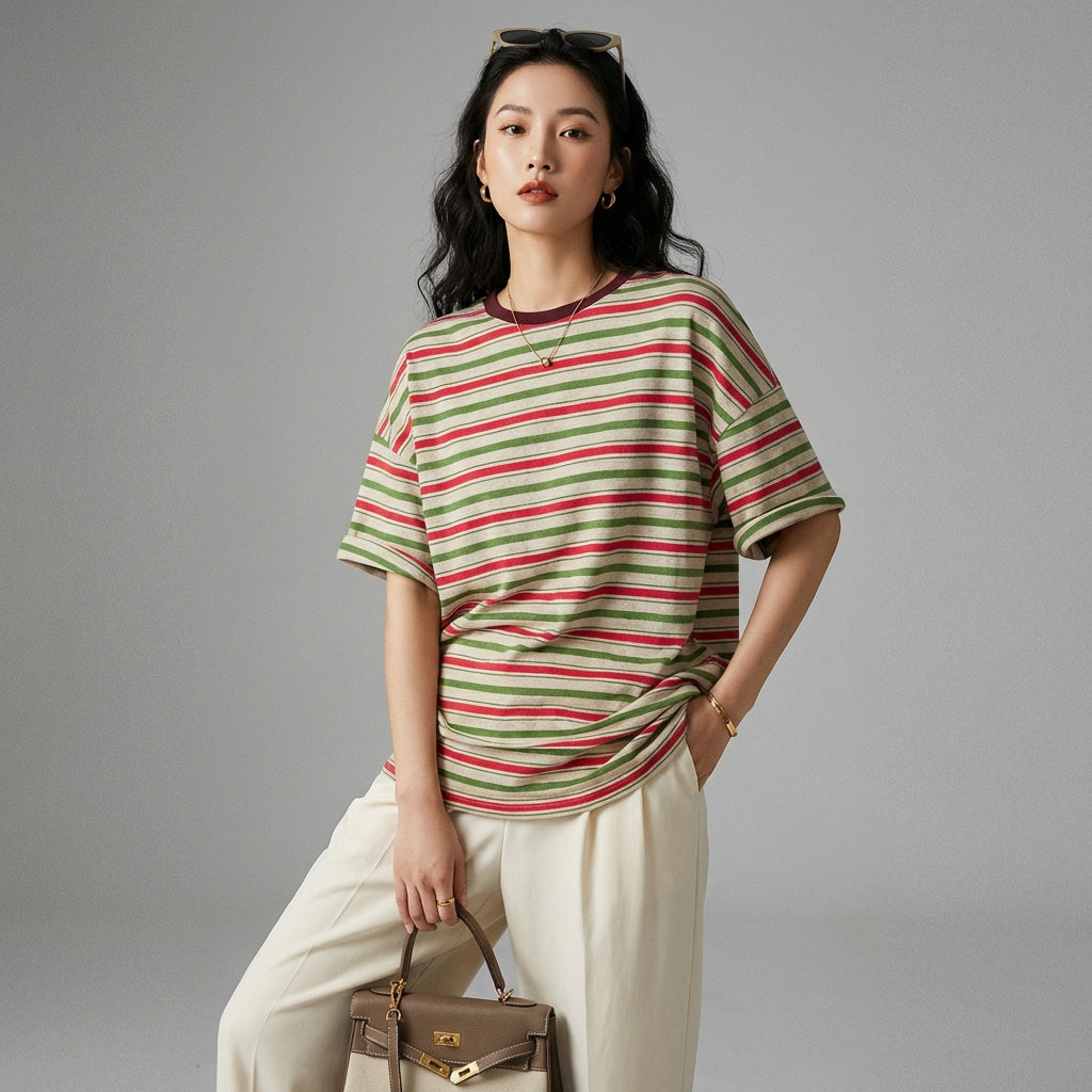 Kreieren Sie einen lässigen und trendigen Look mit unserem kurzärmeligen T-Shirt mit Rundhalsausschnitt, verziert mit eleganten Streifen. Dieses vielseitige Oberteil wurde für Komfort und Stil entworfen und ist ein unverzichtbares Element der modernen Garderobe! 👕