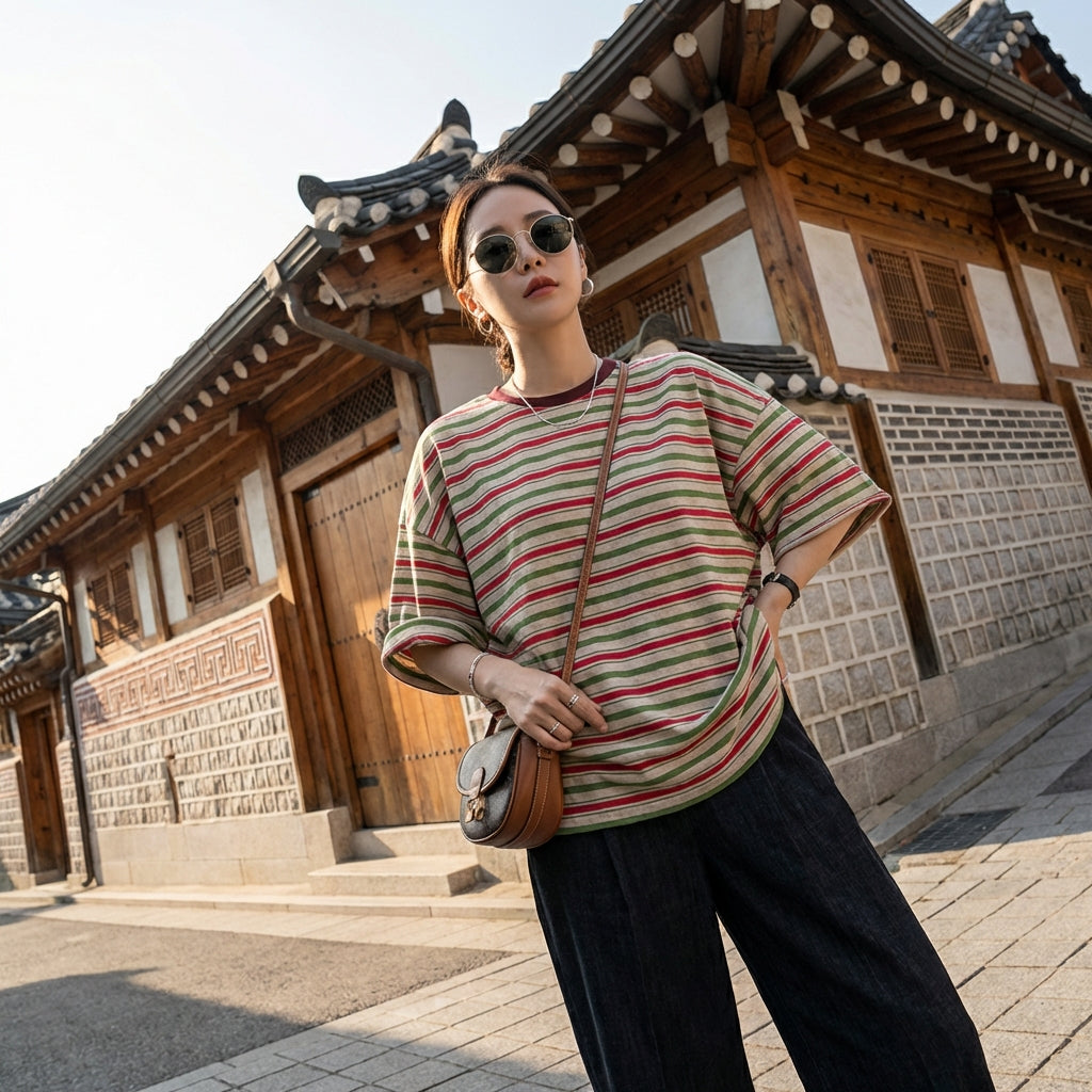 - Stil: Streetwear, Minimalistisch, K-Fashion. Dieses T-Shirt verkörpert die lässige Eleganz der koreanischen Mode, perfekt für einen urbanen und modernen Look.