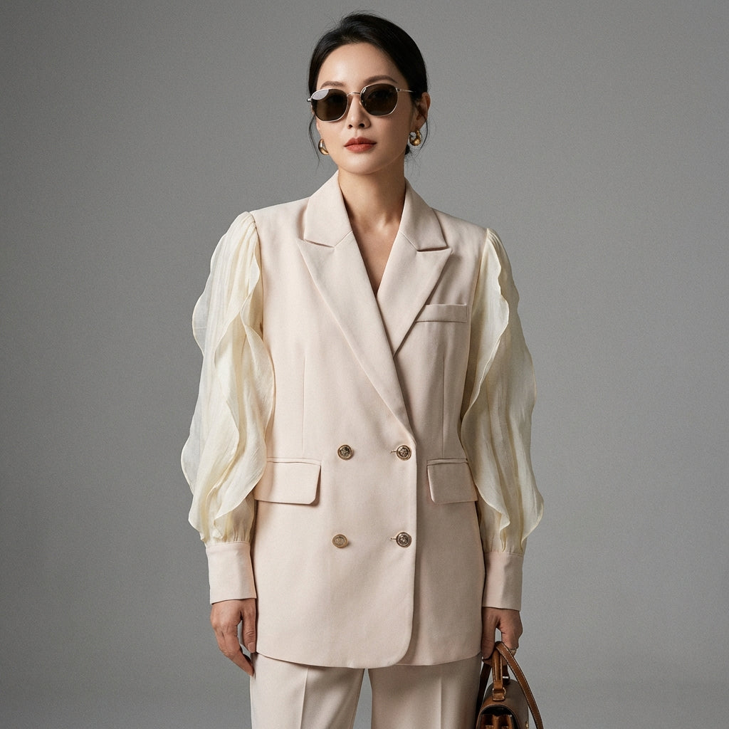 Verleihen Sie sich einen eleganten und lässigen Look mit unserem koreanischen Blazer, perfekt für Herbsttage. Mit einem Reverskragen und einer doppelten Knopfleiste zeichnet er sich durch seine fließenden Chiffonärmel aus, die Ihrem Outfit einen Hauch von Leichtigkeit und Raffinesse verleihen. Ein Must-have für einen schicken und modernen Stil! ✨