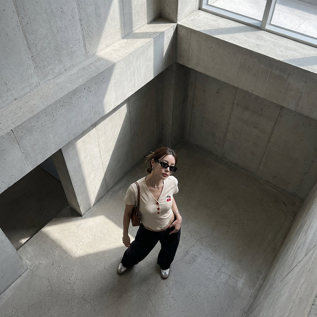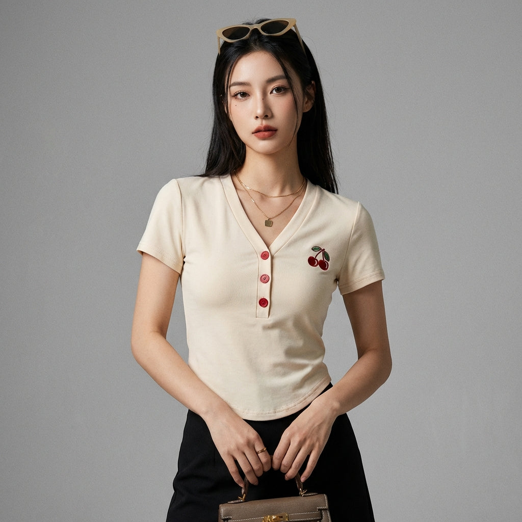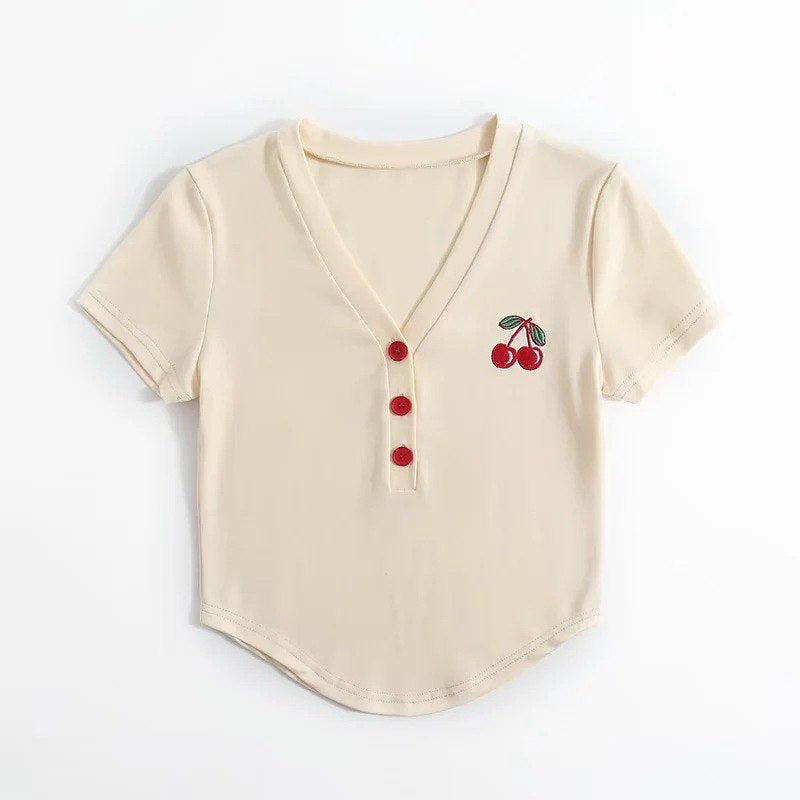 Kreieren Sie einen trendigen und leichten Look mit unserem kurzen T-Shirt, verziert mit charmanten Kirschstickereien. Sein V-Ausschnitt und die figurbetonte Passform betonen Ihre Silhouette, perfekt für sonnige Tage! 🍒