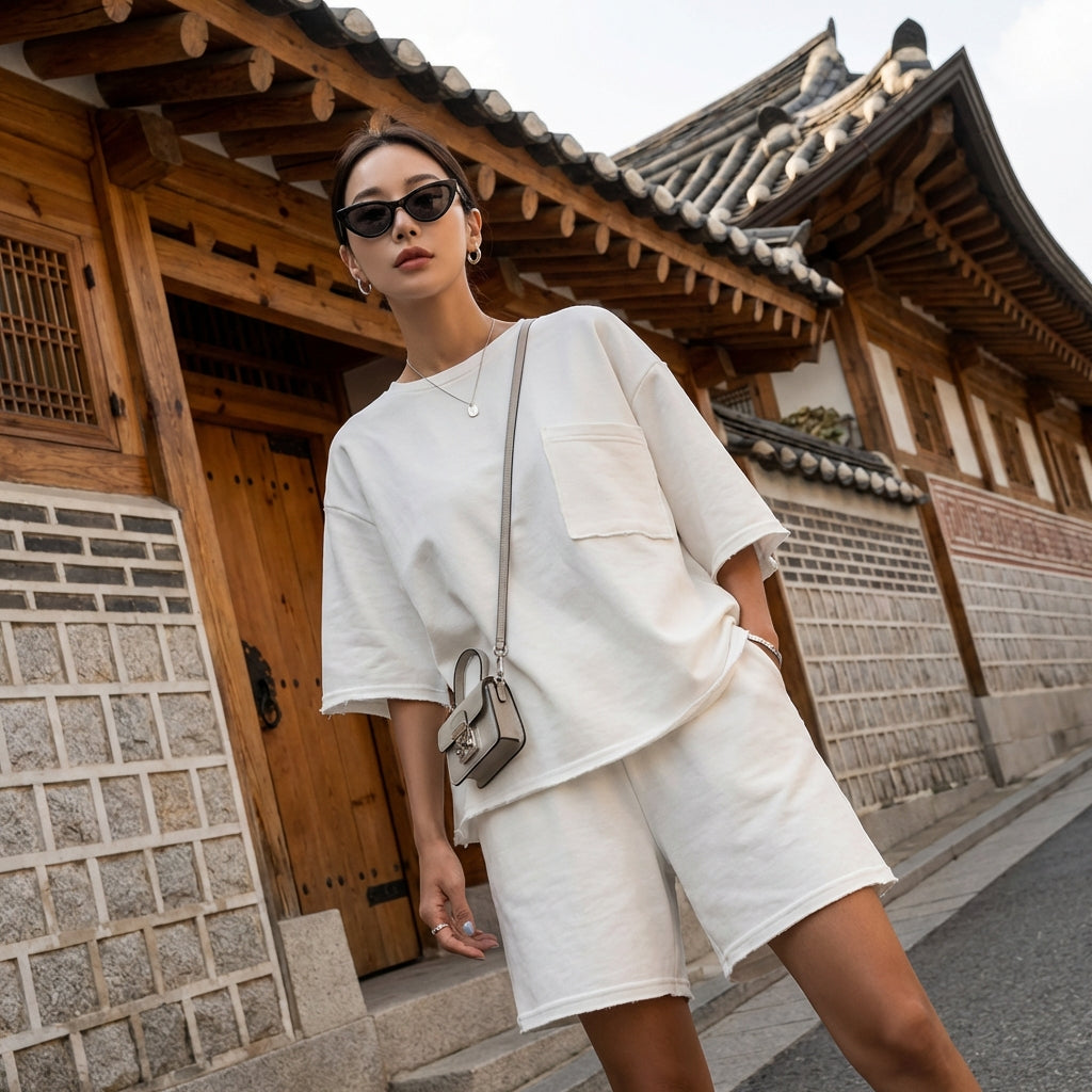 - Stil: Lässig, Streetwear, Sommerlich. Dieses Set verkörpert lässige Mode mit einem modernen Touch, perfekt für einen urbanen und entspannten Look.