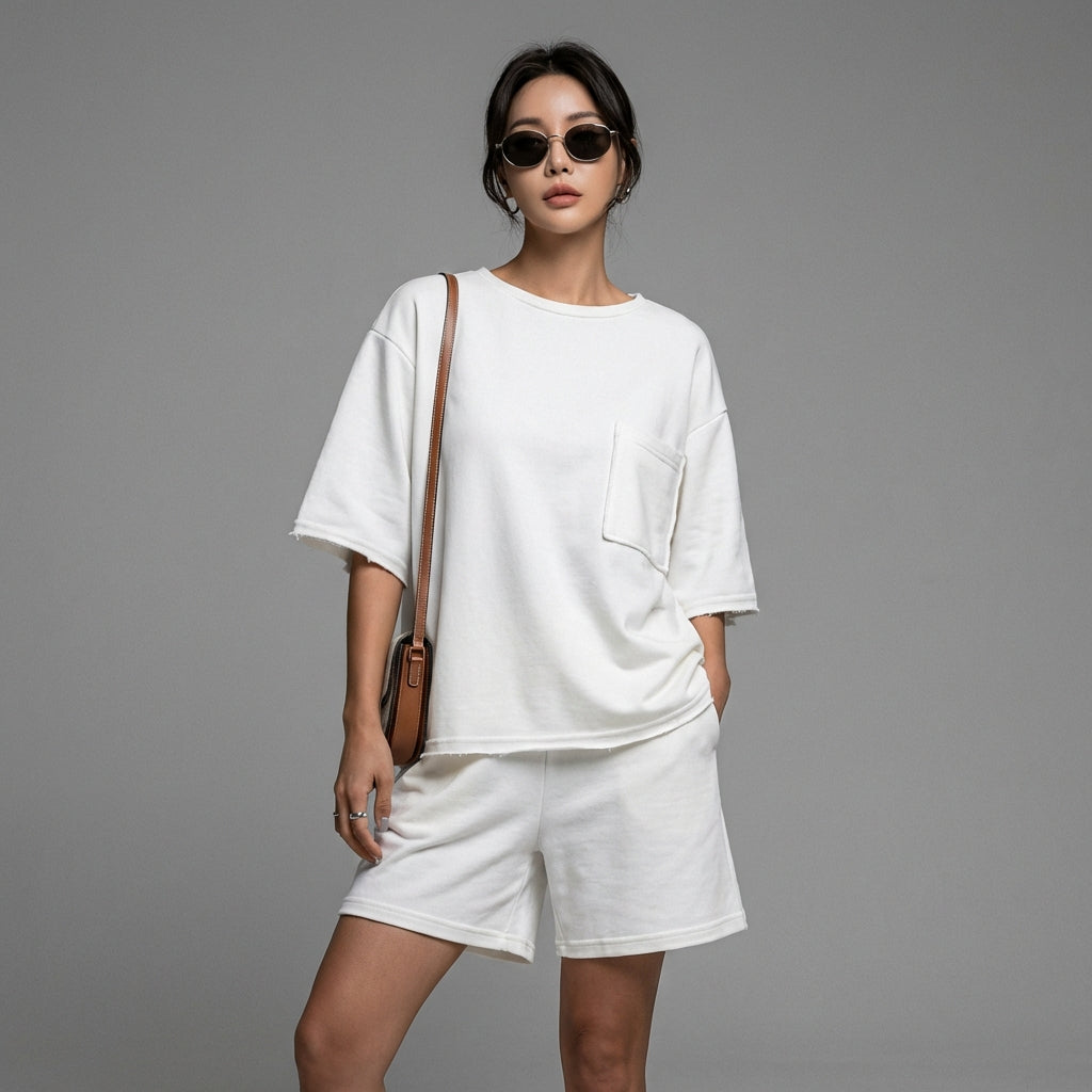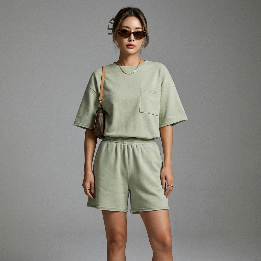 Entdecken Sie unser lässiges Set, bestehend aus einem Rundhals-Top mit kurzen Ärmeln und passenden Shorts. Perfekt für einen sommerlichen und bequemen Look, vereint dieses Set Einfachheit und Stil für Ihre sonnigen Tage! ☀️