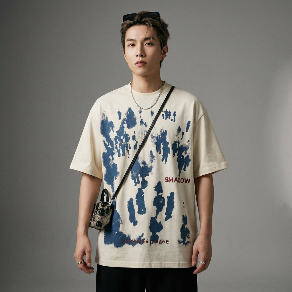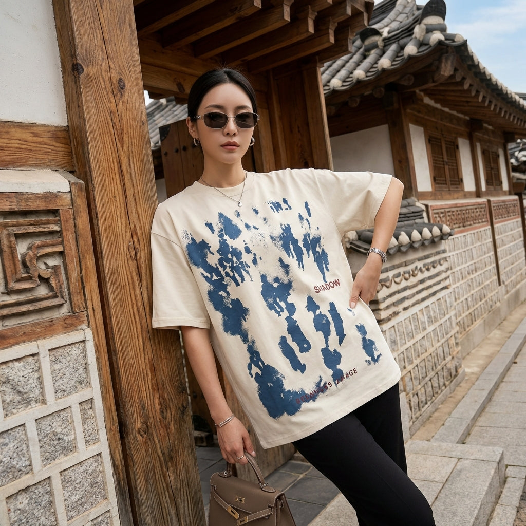 - Stil: Streetwear, K-Fashion, Trend, Urban. Dieses T-Shirt verkörpert den Geist der zeitgenössischen koreanischen Mode mit einem künstlerischen Touch.
