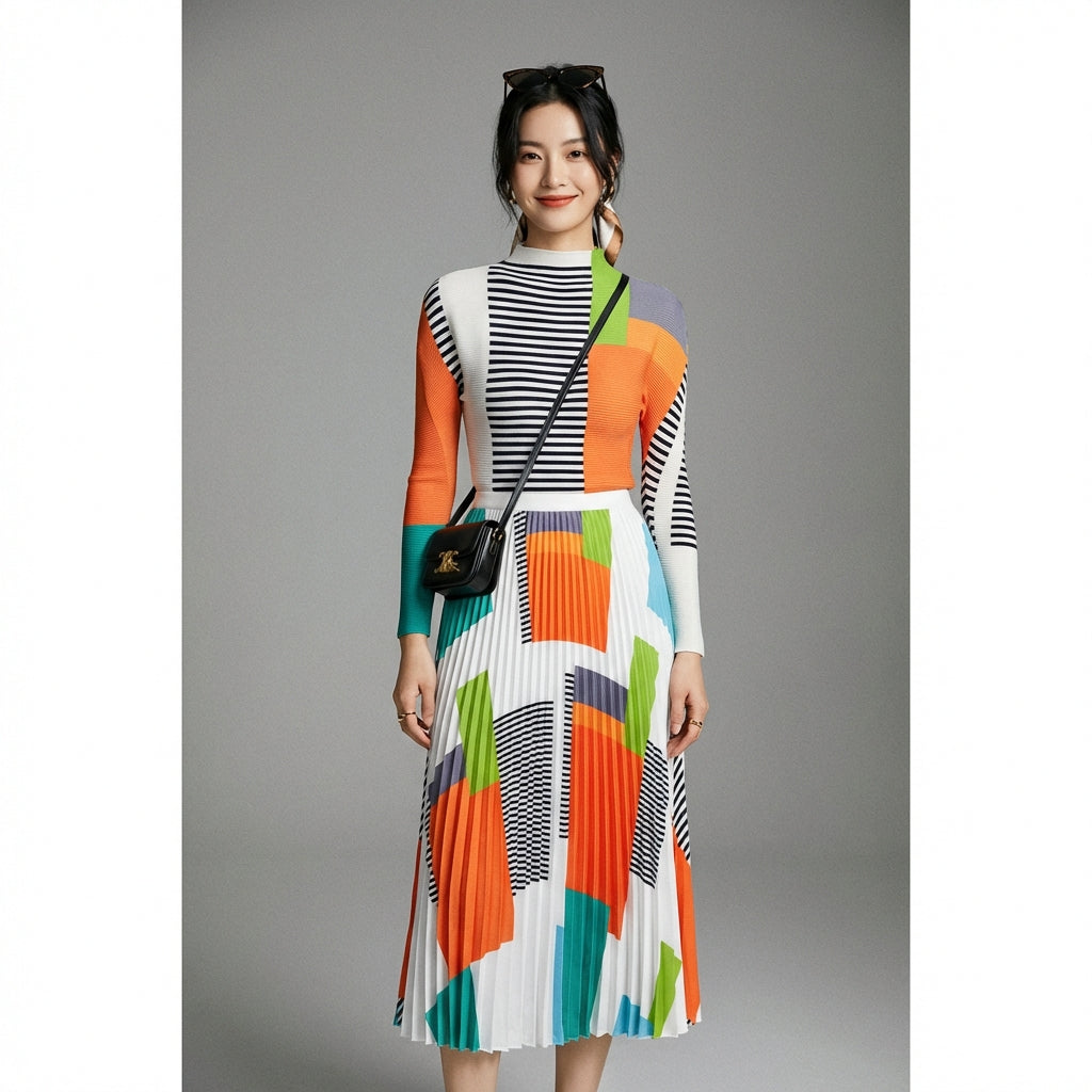 Betonen Sie Ihren Stil mit diesem modernen und eleganten Set, bestehend aus einem langärmeligen Oberteil und einem hoch taillierten Faltenrock. Sein kühnes Color-Block-Design verleiht einen frischen und originellen Touch, perfekt für einen trendigen und lässigen Look! ☀️