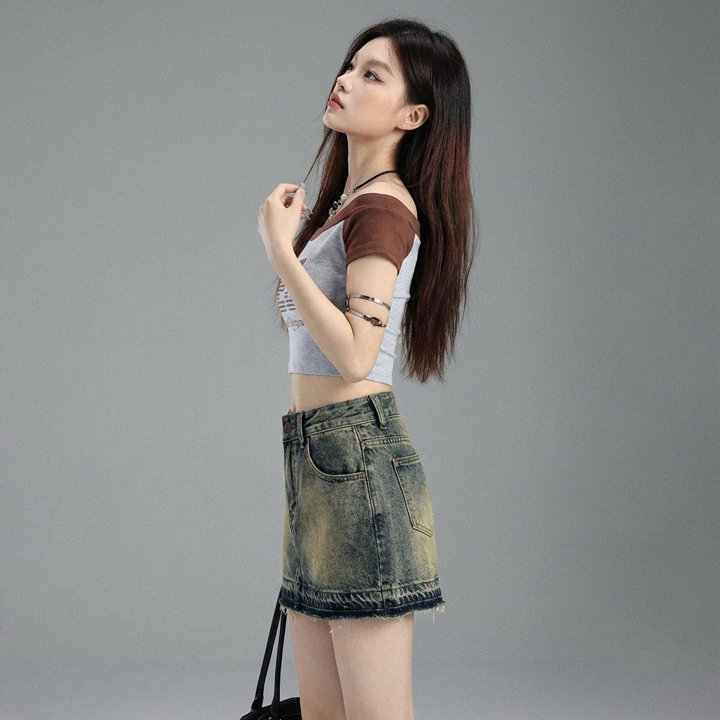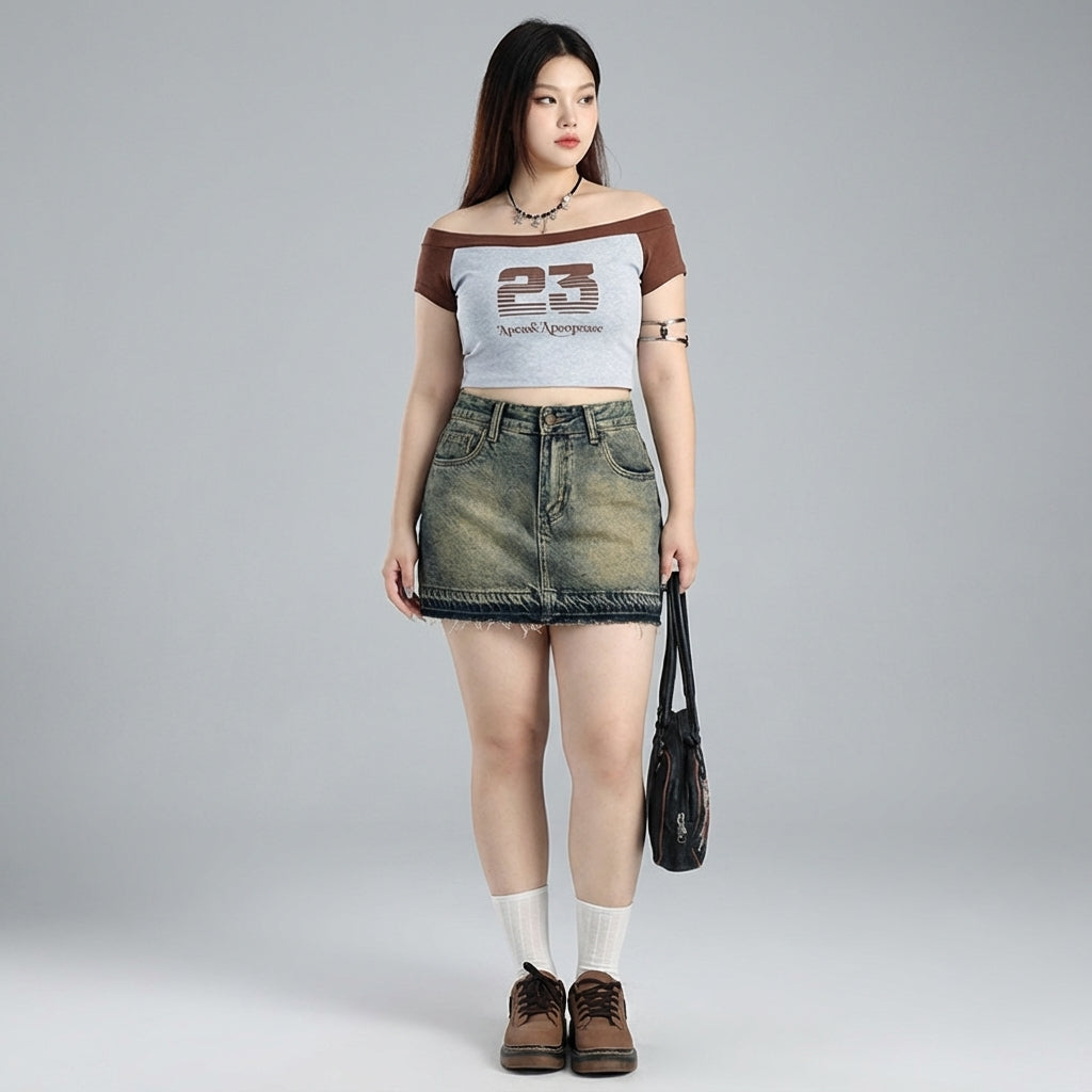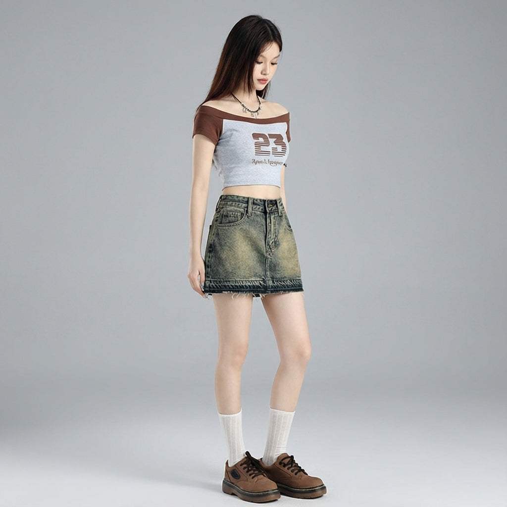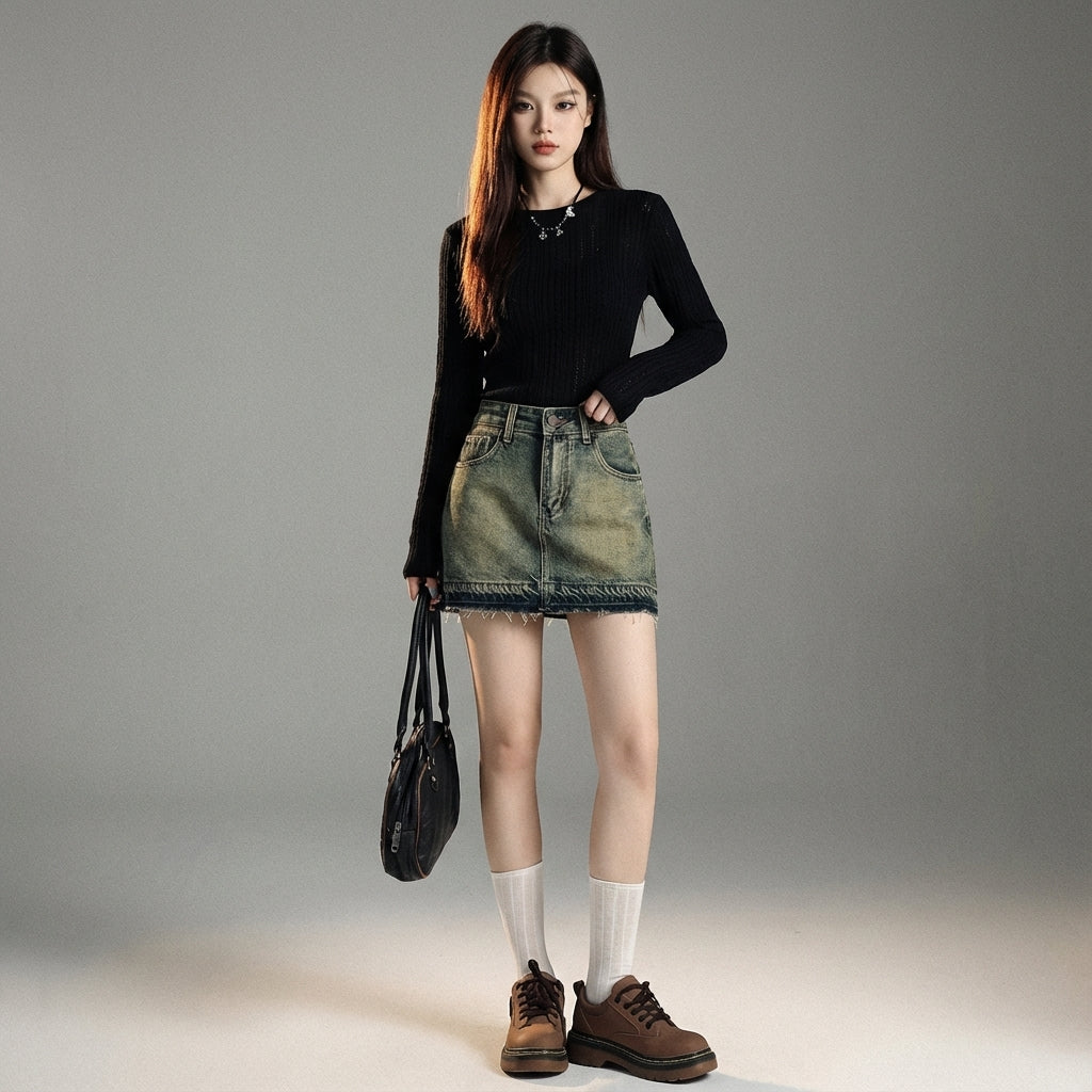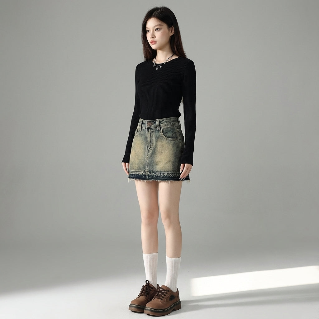 Betonen Sie Ihren Stil mit unserem verwaschenen Jeans-Minirock, einem ikonischen Stück der koreanischen Mode. Sein hoher, figurbetonter Schnitt schmeichelt der Silhouette, während die Vintage-Details ihm einen einzigartigen Charme verleihen. Perfekt für einen urbanen und trendigen Look! ✨