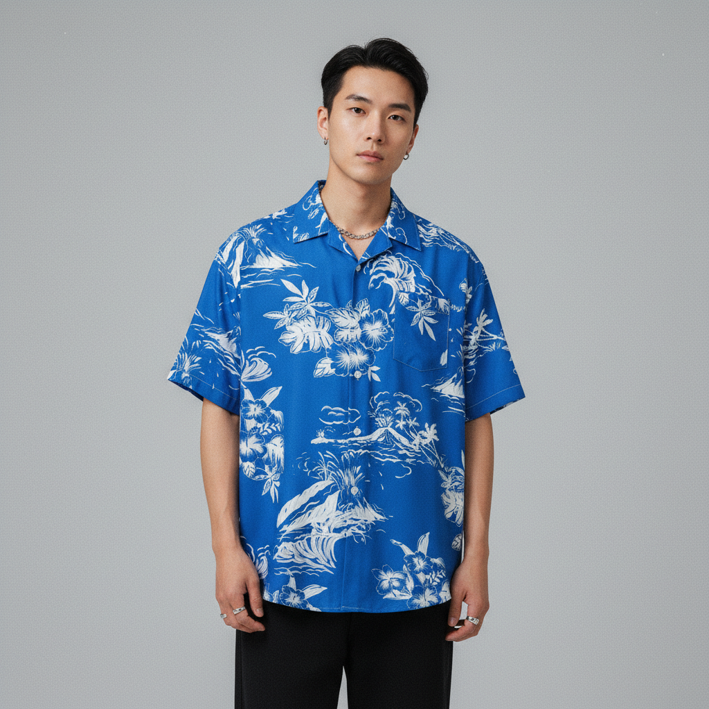 - Stil: Streetwear, Koreanische Mode, Trend. Dieses Hemd verkörpert den urbanen und lässigen Stil der K-Fashion, mit einem Hauch von floraler Originalität.