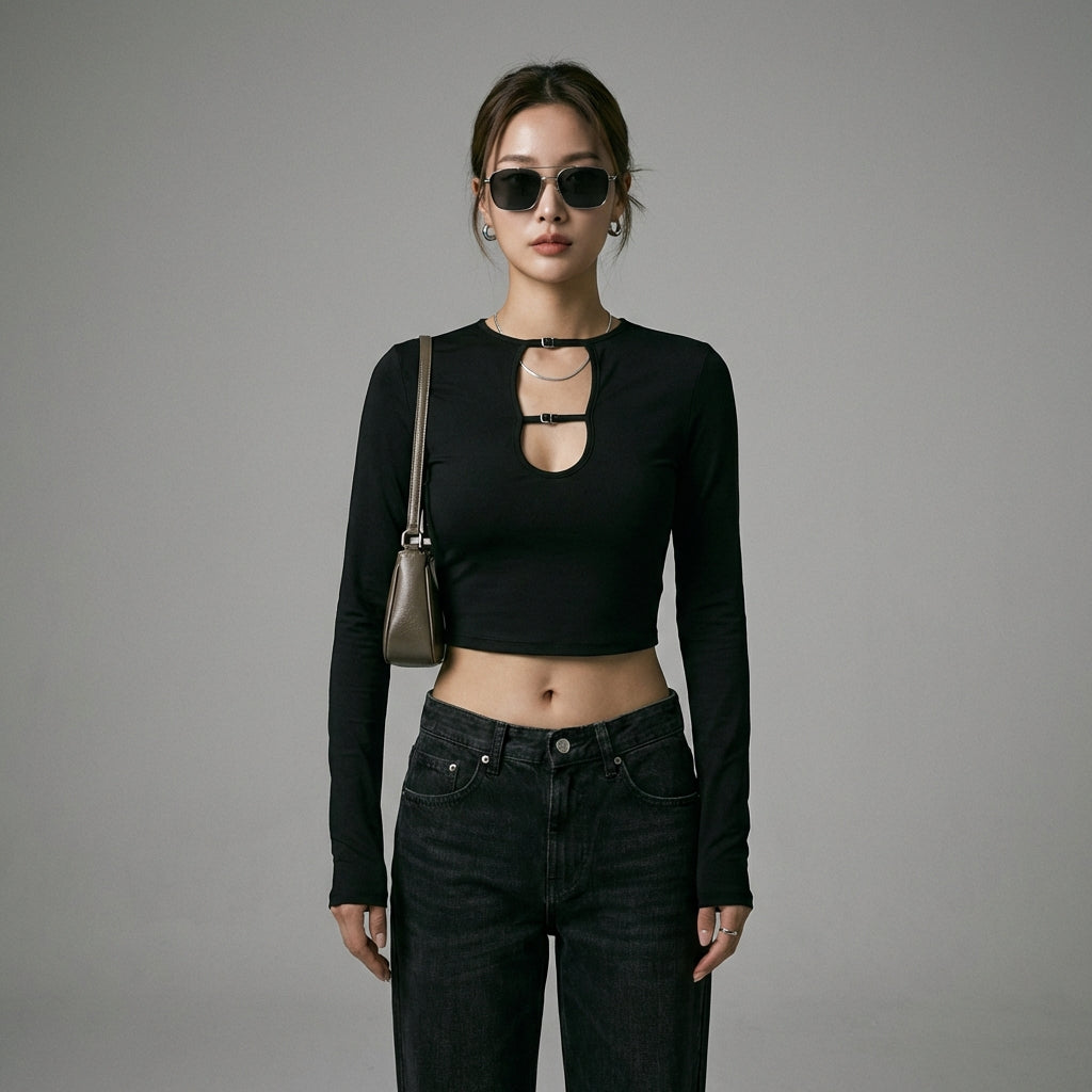 Betonen Sie Ihren Stil mit unserem schwarzen, kurzen T-Shirt, perfekt für einen lässigen und trendigen Look. Sein figurbetonter Schnitt und die langen Ärmel machen es zu einem Must-have für einen urbanen Chic! ✨