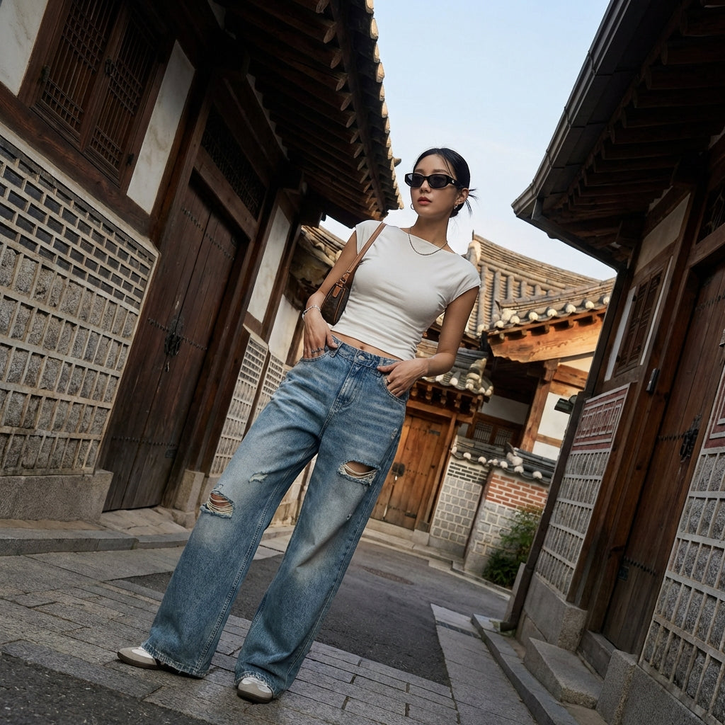 - Stil: Streetwear, Lässig, K-Fashion. Diese Jeans verkörpert den Geist der koreanischen Urban Fashion, ideal für einen modernen und mühelosen Look.