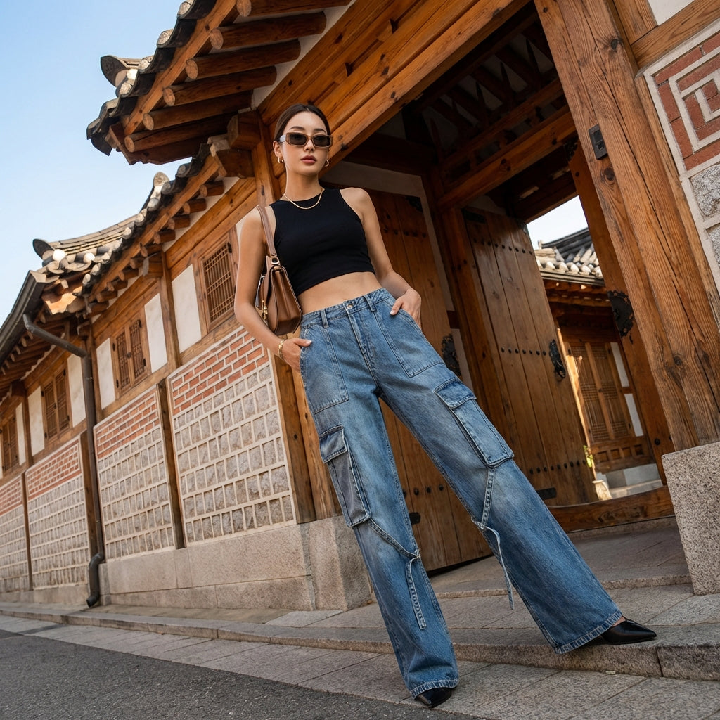Diese Cargo-Jeans ist das Herzstück für alle, die einen selbstbewussten Stil und unvergleichlichen Komfort suchen, eine unverzichtbare Ergänzung für jede von koreanischer Mode inspirierte Garderobe.