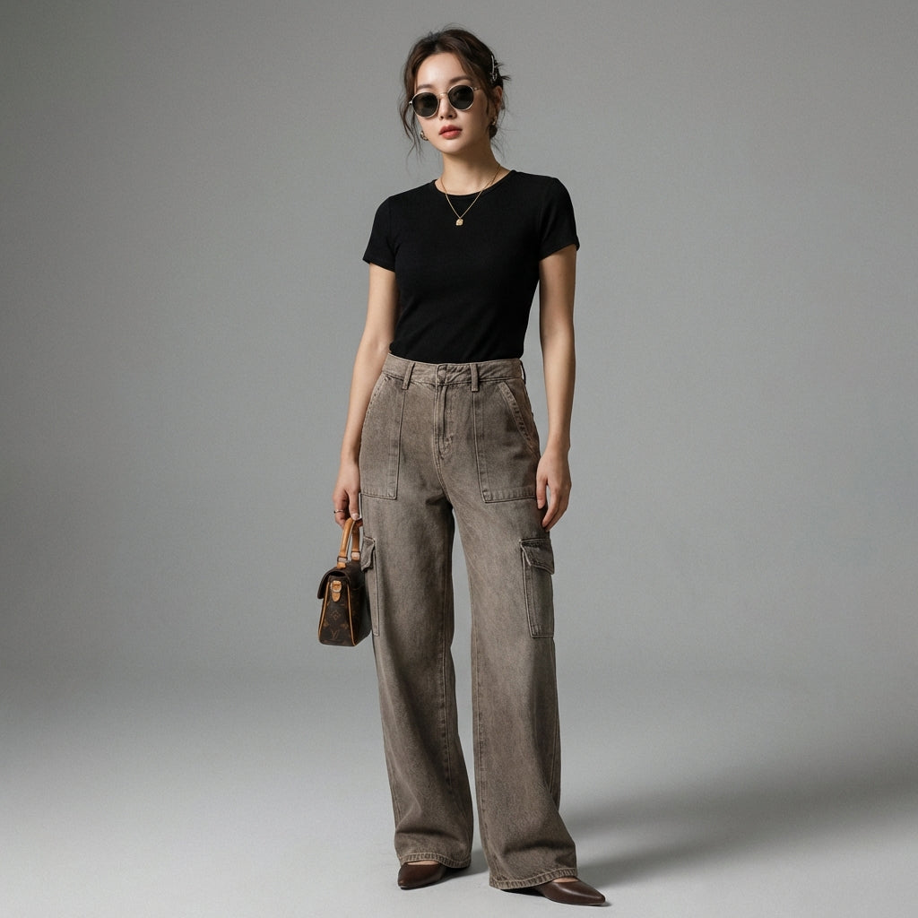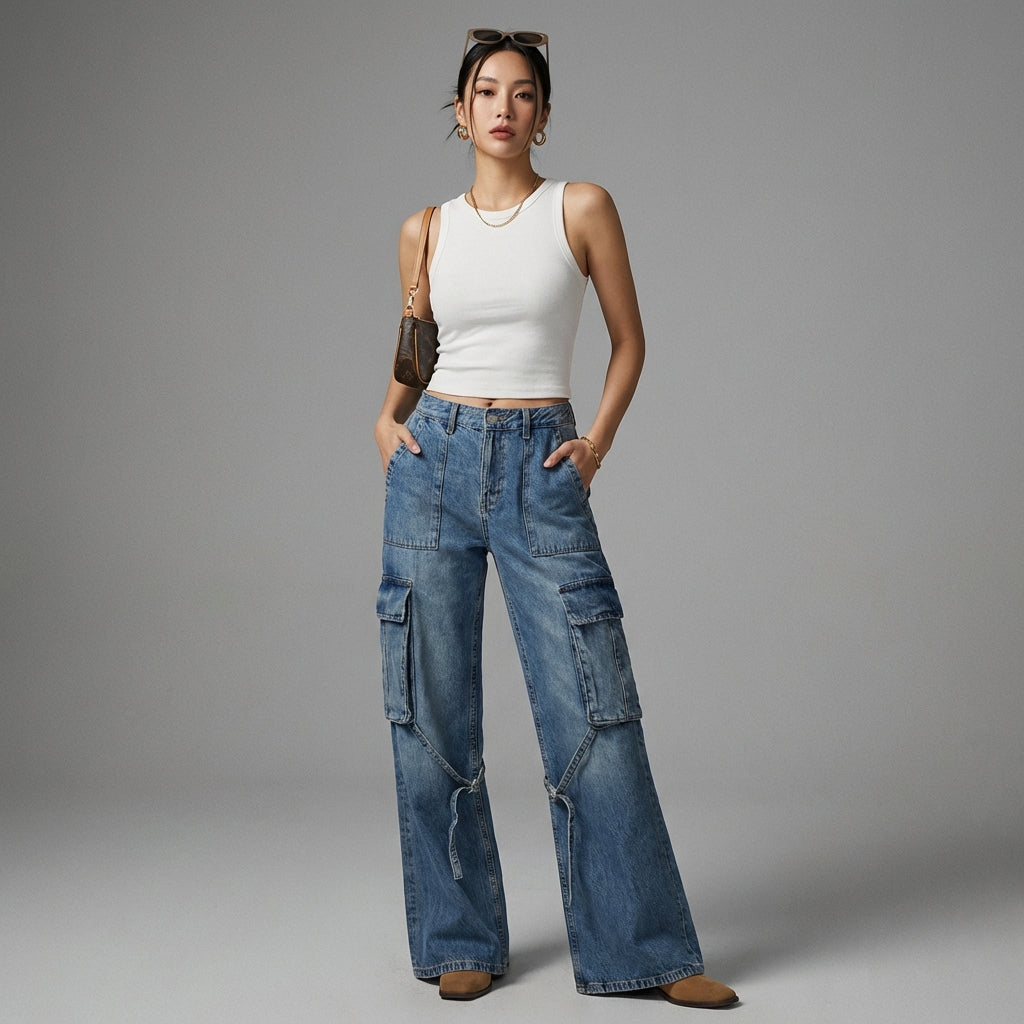Entscheiden Sie sich für den lässigen und trendigen Stil mit unserer High-Waist Cargo-Jeans, perfekt für einen urbanen und modernen Look. Ihr weiter Schnitt und die praktischen Taschen vereinen Komfort und Funktionalität, inspiriert von K-Fashion-Trends! 👖