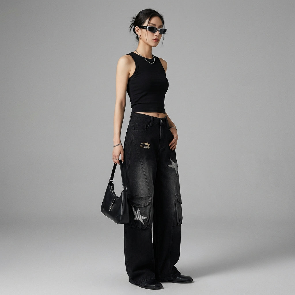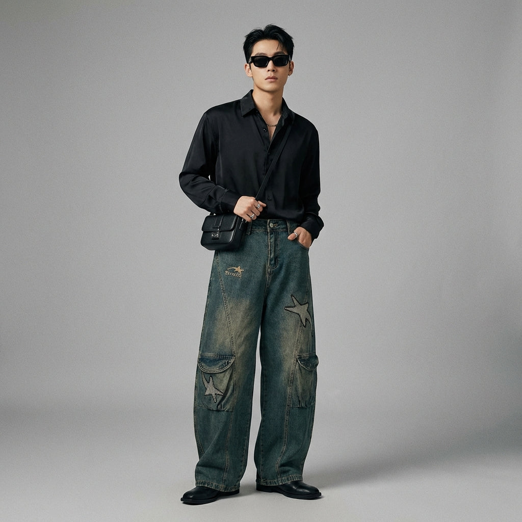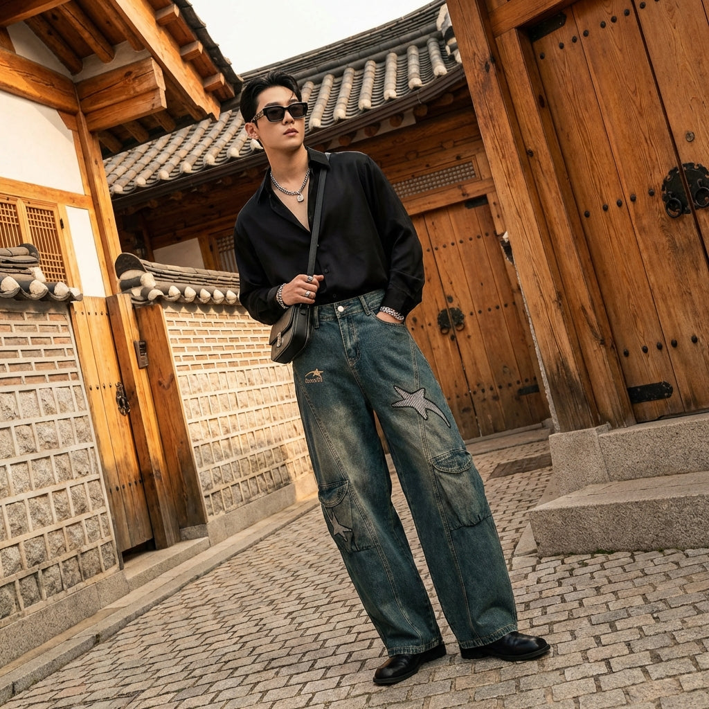 Diese weite Denimhose ist der perfekte Verbündete für alle, die Komfort, Stil und Originalität suchen und dabei einen Retro- und Streetwear-Touch im koreanischen Modestil hinzufügen möchten.