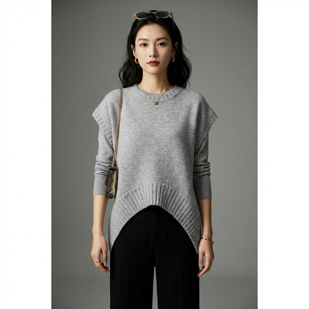 Kreieren Sie einen modernen und lässigen Look mit unserer gestrickten Pulloverweste, die sich durch ihren unregelmäßigen Saum und ihren Rundhalsausschnitt auszeichnet. Ideal zum Überziehen und um Ihren Alltagsoutfits eine einzigartige Note zu verleihen! ✨
